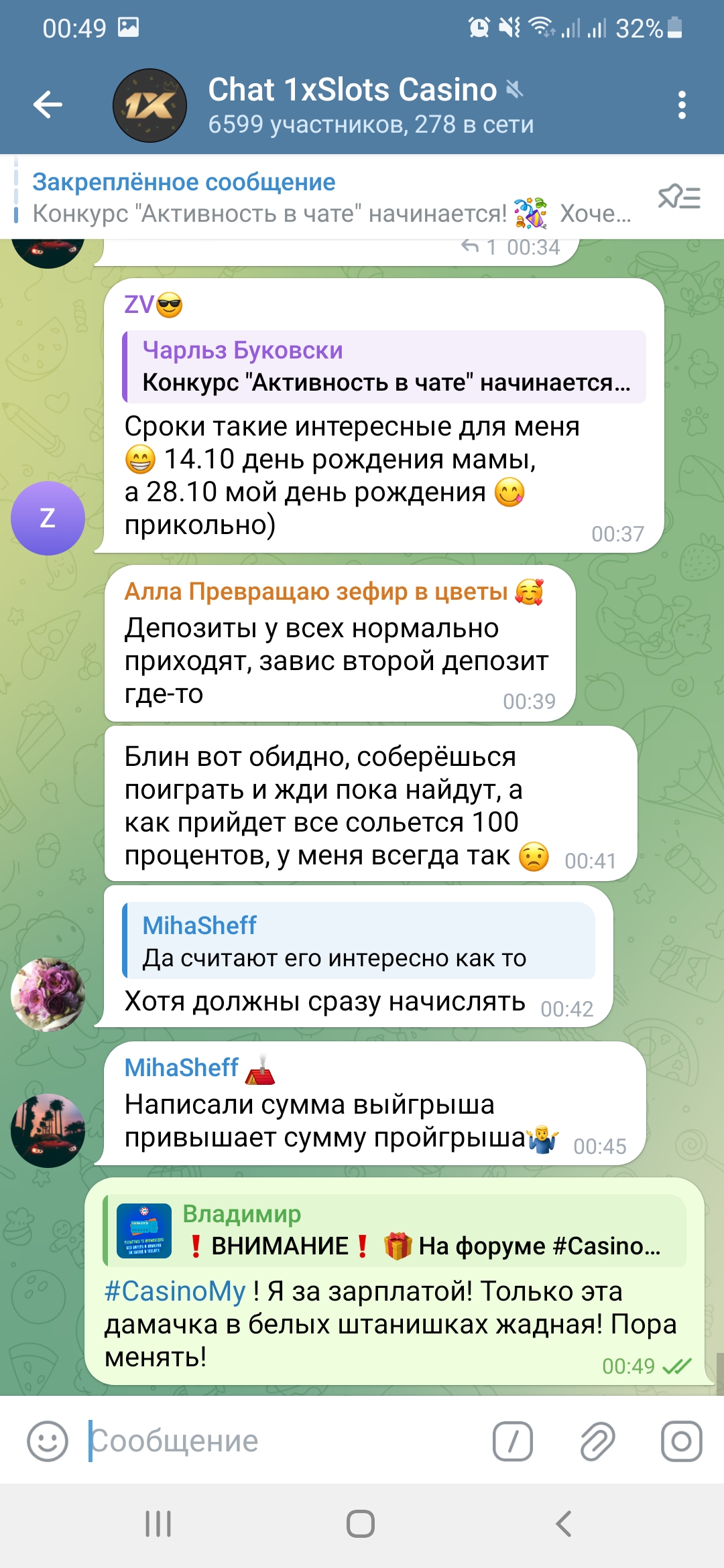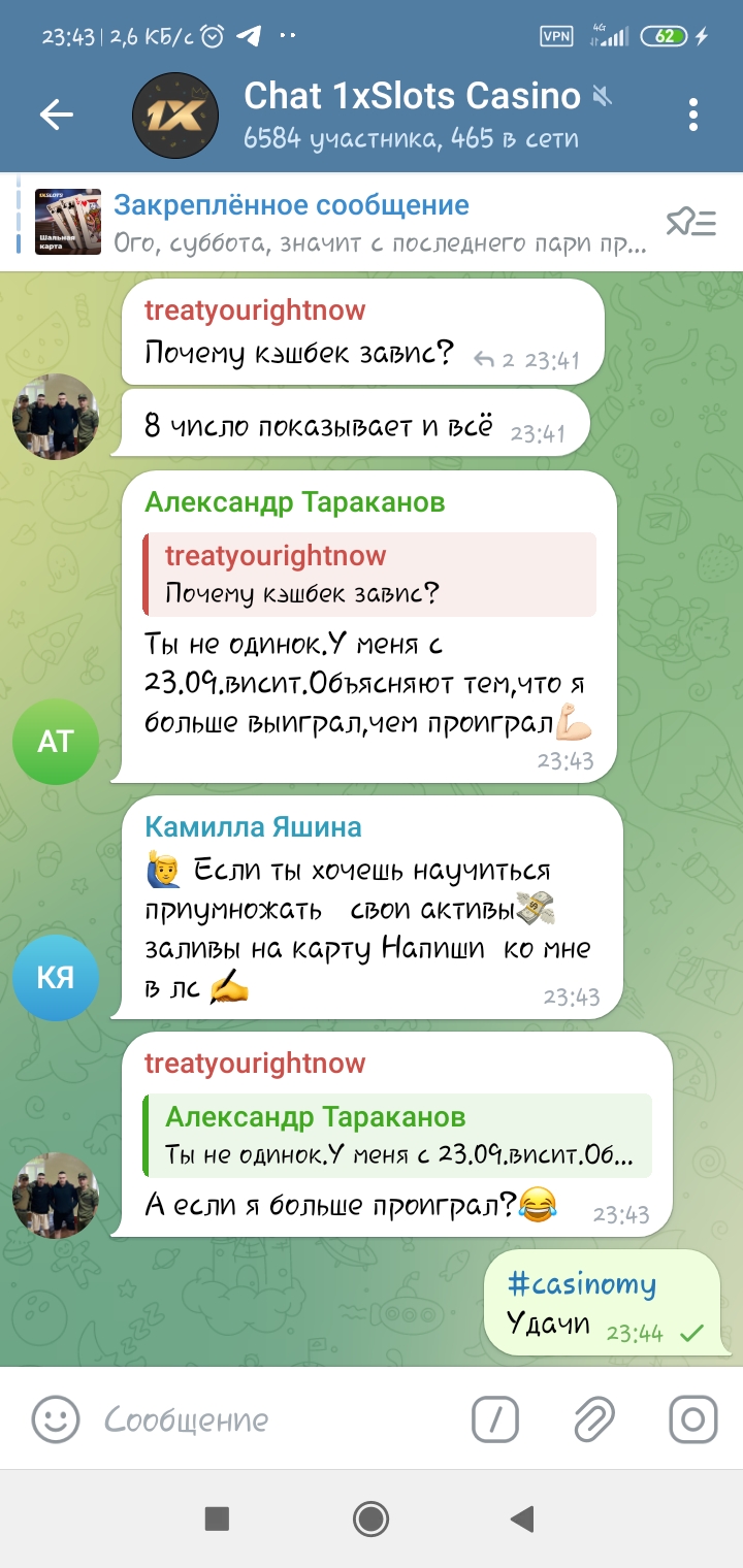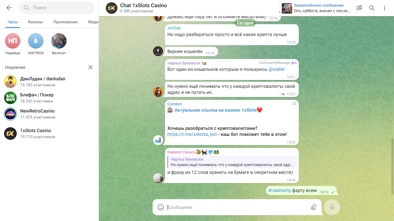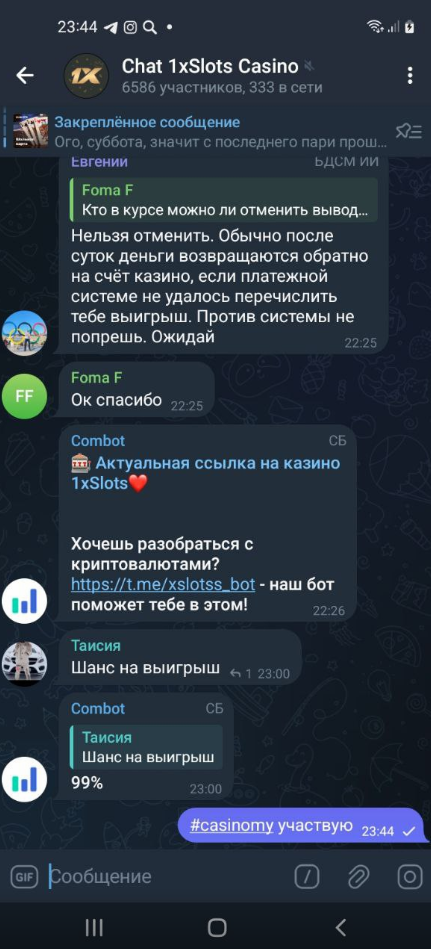 2) Быть подписанным на наш новый форум в телеграмм https://t.me/forumcasinomy, чат https://t.me/casinomyforum и чат казино 1xSlots https://t.me/joinchat/TCG5aNJ_qCpI6SdO, в телеграмм чате 1xSlots https://t.me/joinchat/TCG5aNJ_qCpI6SdO написать любое сообщение с тегом #casinomy и разместить текст этого сообщения в этой теме вместе со скрином депозита.