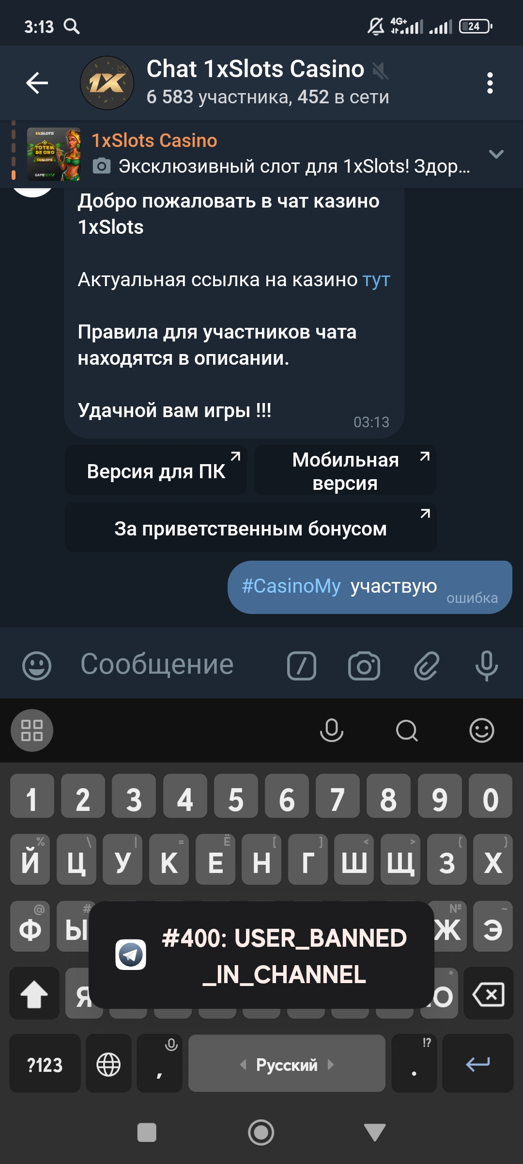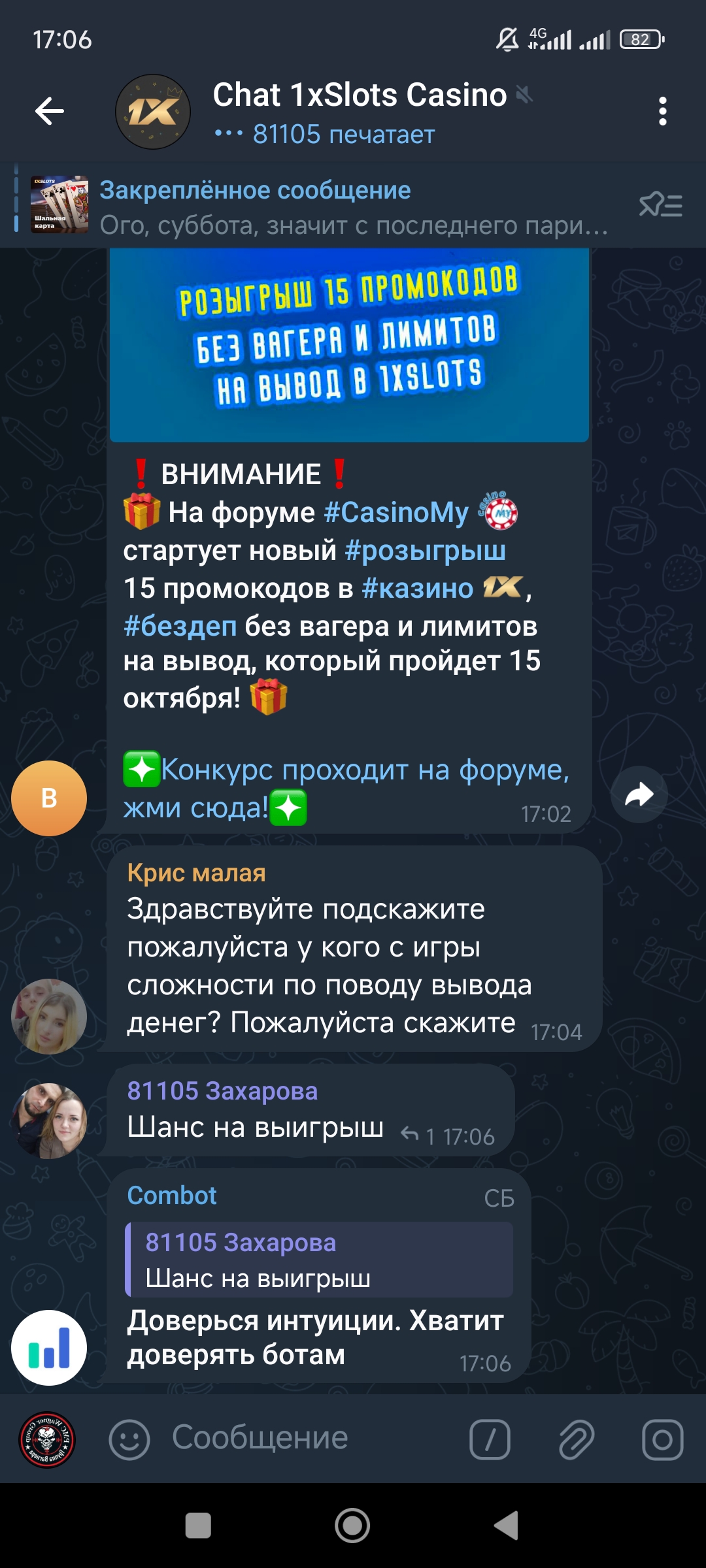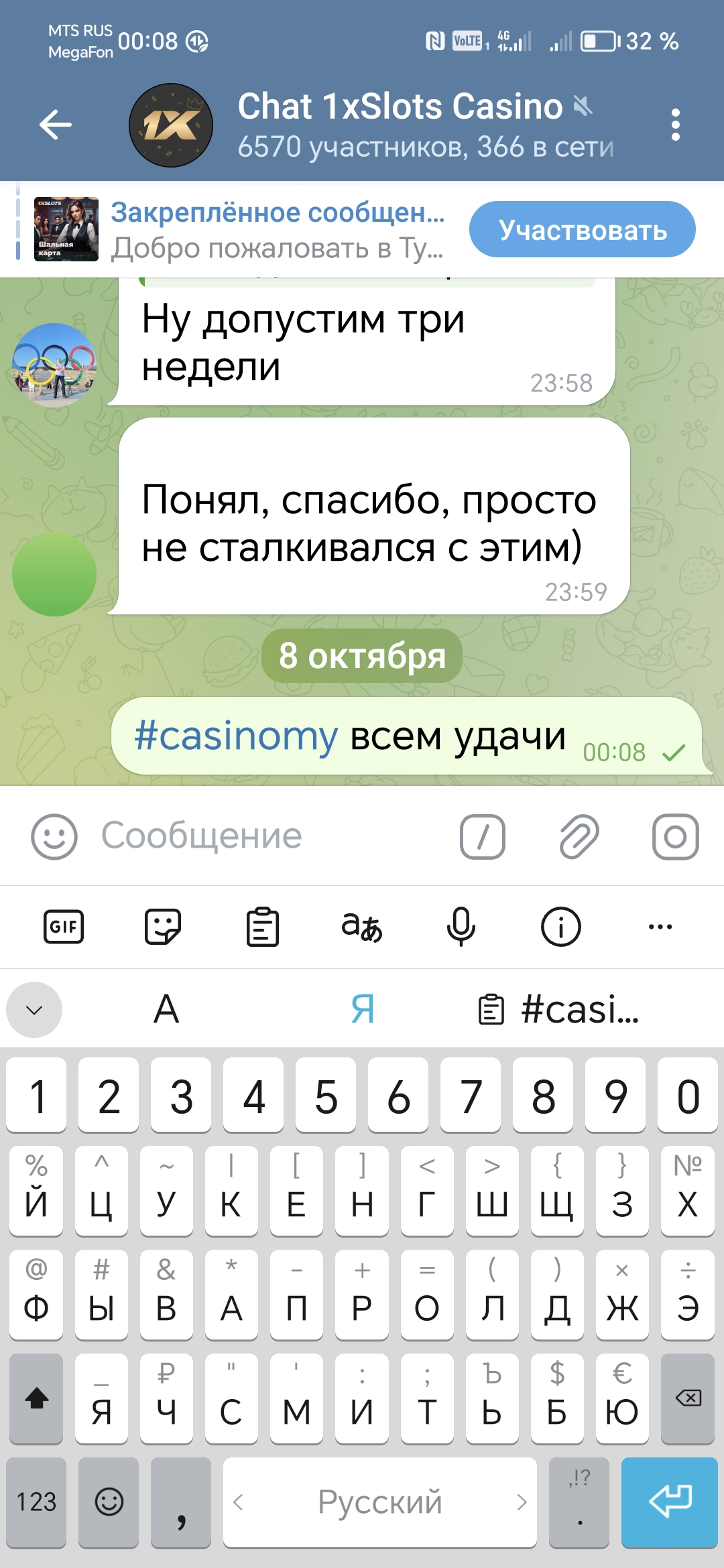 2) Быть подписанным на наш новый форум в телеграмм https://t.me/forumcasinomy, чат https://t.me/casinomyforum и чат казино 1xSlots https://t.me/joinchat/TCG5aNJ_qCpI6SdO, в телеграмм чате 1xSlots https://t.me/joinchat/TCG5aNJ_qCpI6SdO написать любое сообщение с тегом #casinomy и разместить текст этого сообщения в этой теме вместе со скрином депозита.