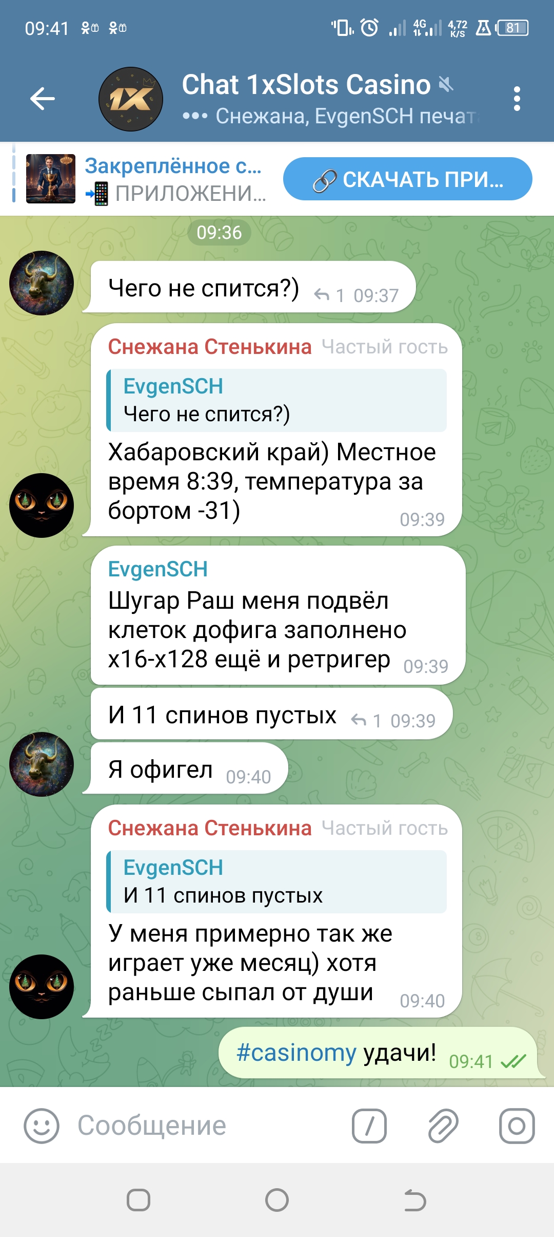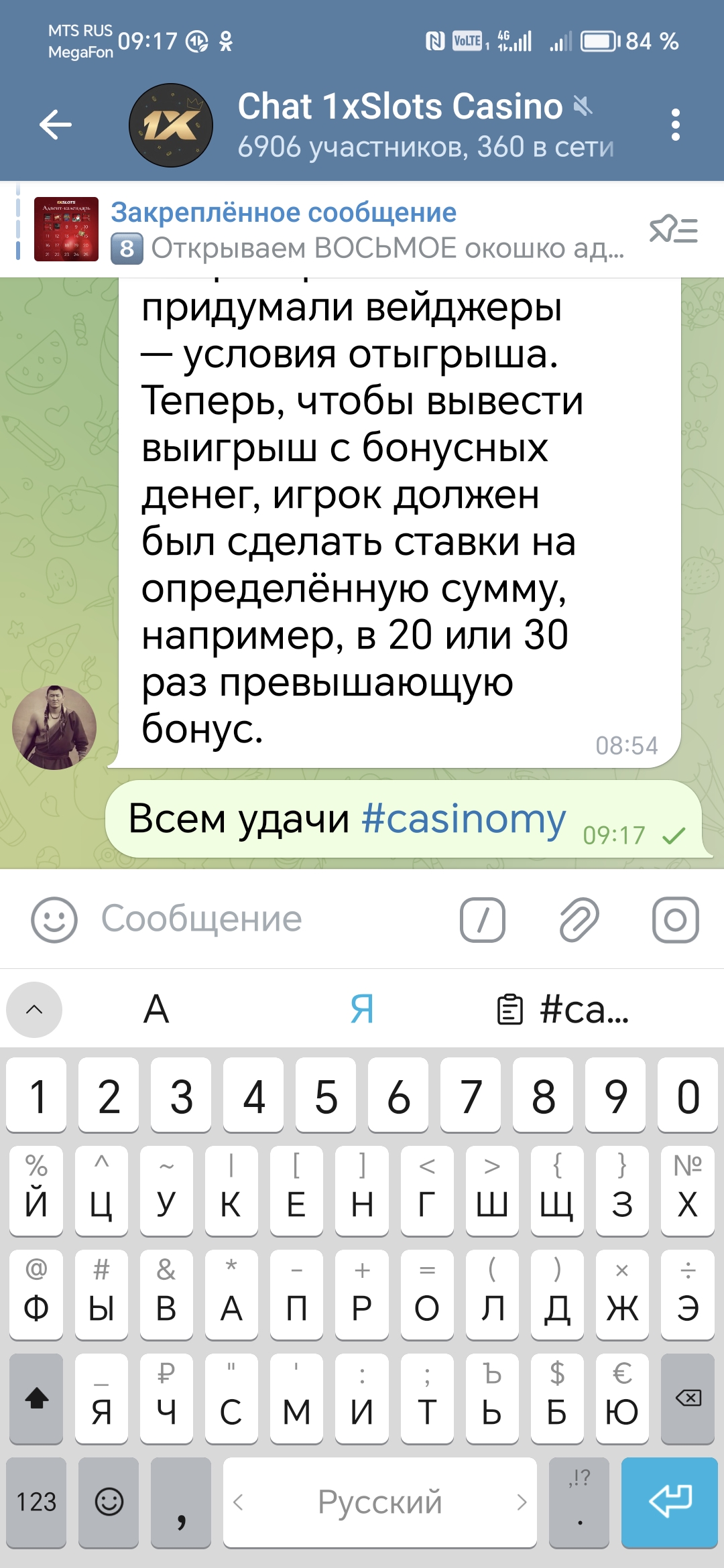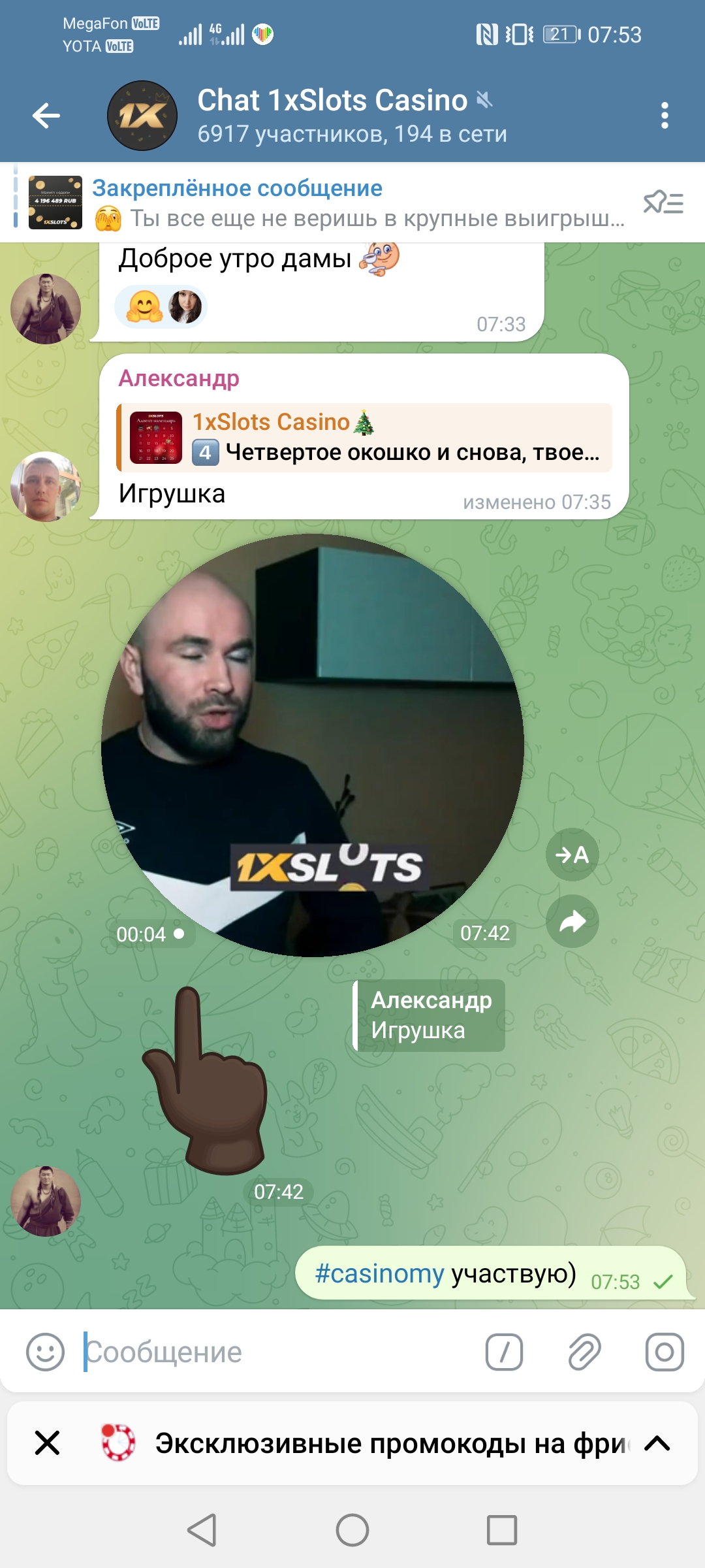 2) Быть подписанным на наш новый форум в телеграмм https://t.me/forumcasinomy, чат https://t.me/casinomyforum и чат казино 1xSlots https://t.me/joinchat/TCG5aNJ_qCpI6SdO, в телеграмм чате 1xSlots https://t.me/joinchat/TCG5aNJ_qCpI6SdO написать любое сообщение с тегом #casinomy и разместить текст этого сообщения в этой теме вместе со скрином депозита.