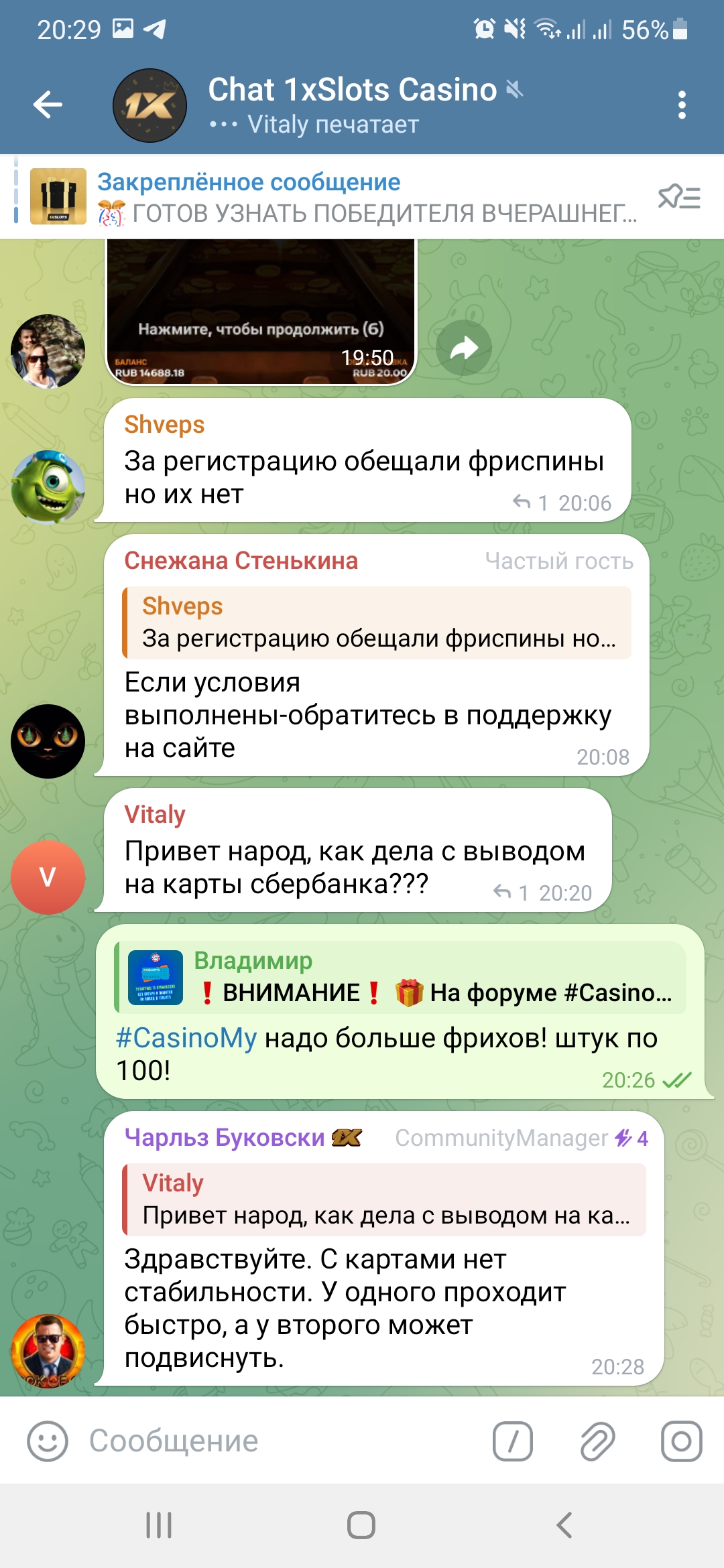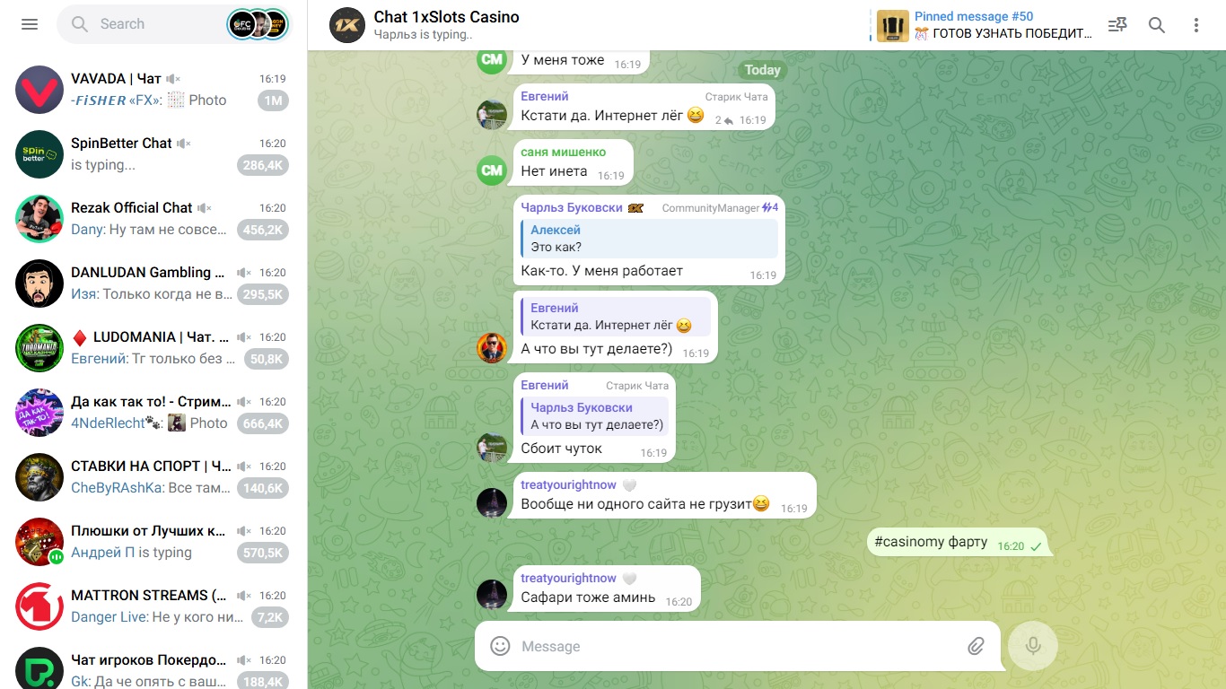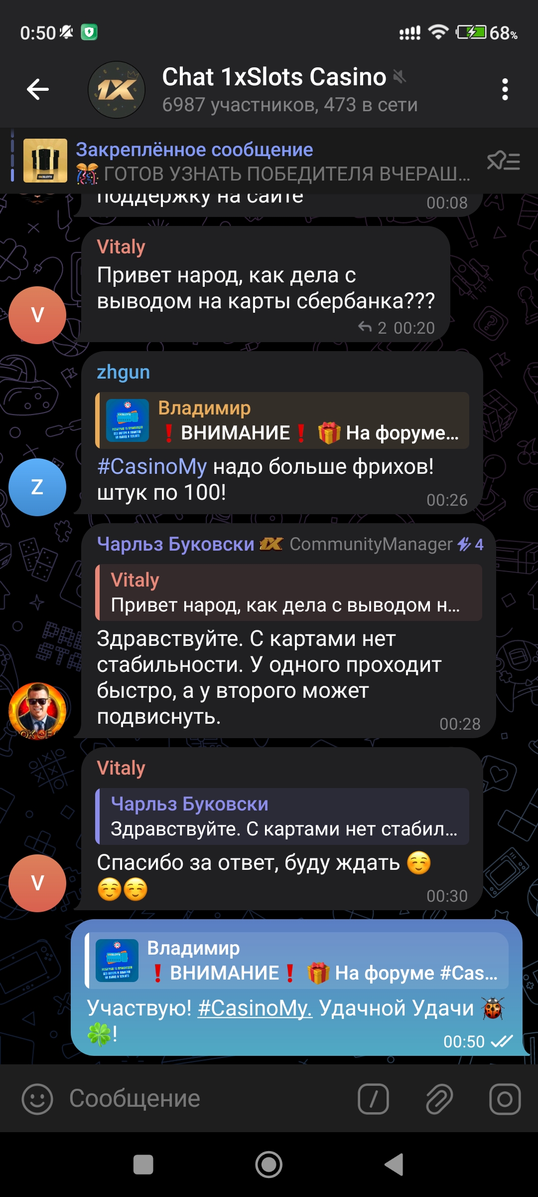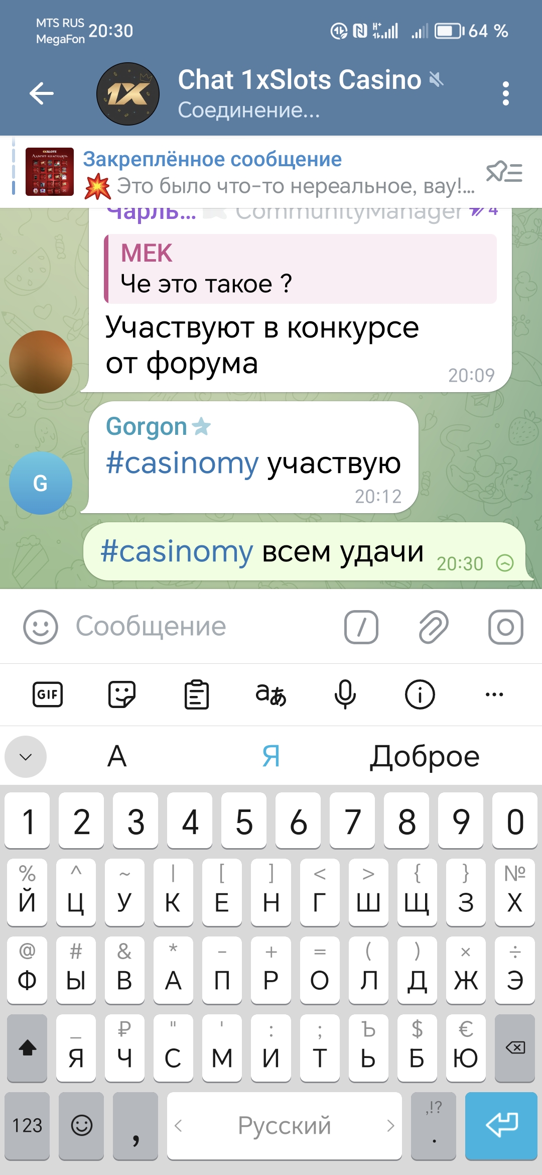 2) Быть подписанным на наш новый форум в телеграмм https://t.me/forumcasinomy, чат https://t.me/casinomyforum и чат казино 1xSlots https://t.me/joinchat/TCG5aNJ_qCpI6SdO, в телеграмм чате 1xSlots https://t.me/joinchat/TCG5aNJ_qCpI6SdO написать любое сообщение с тегом #casinomy и разместить текст этого сообщения в этой теме вместе со скрином депозита.
