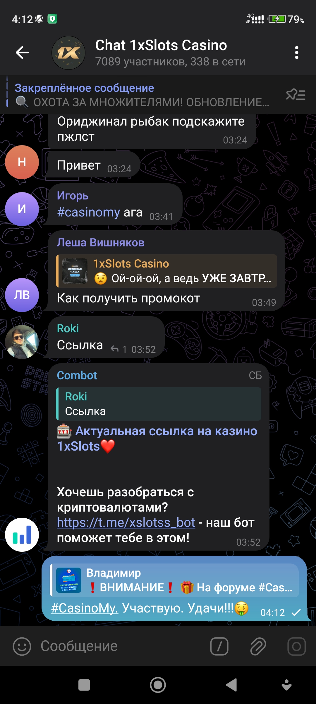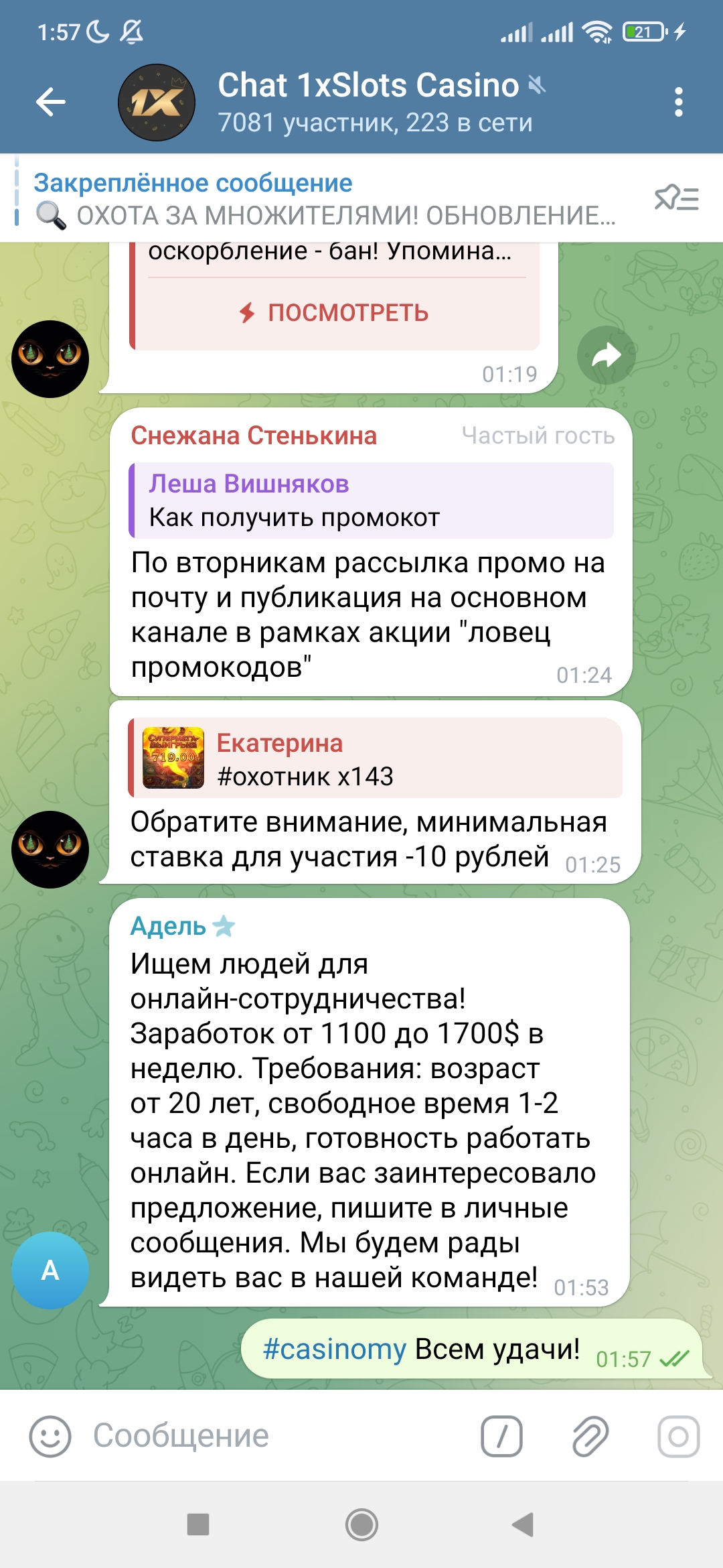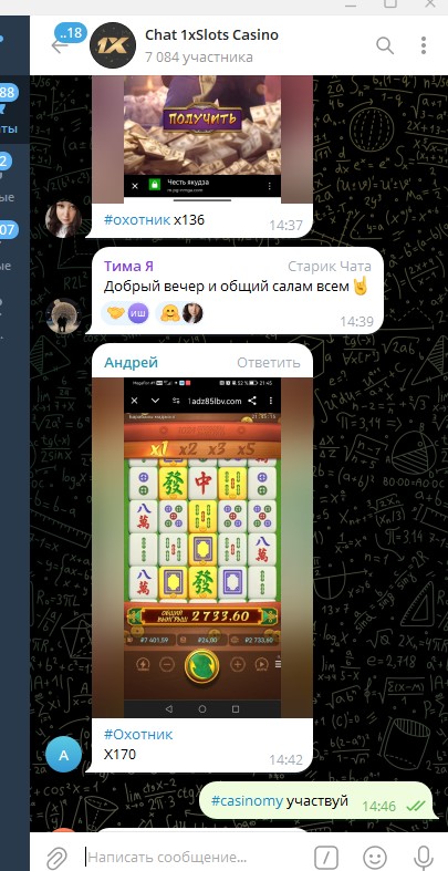 2) Быть подписанным на наш новый форум в телеграмм https://t.me/forumcasinomy, чат https://t.me/casinomyforum и чат казино 1xSlots https://t.me/joinchat/TCG5aNJ_qCpI6SdO, в телеграмм чате 1xSlots https://t.me/joinchat/TCG5aNJ_qCpI6SdO написать любое сообщение с тегом #casinomy и разместить текст этого сообщения в этой теме вместе со скрином депозита.