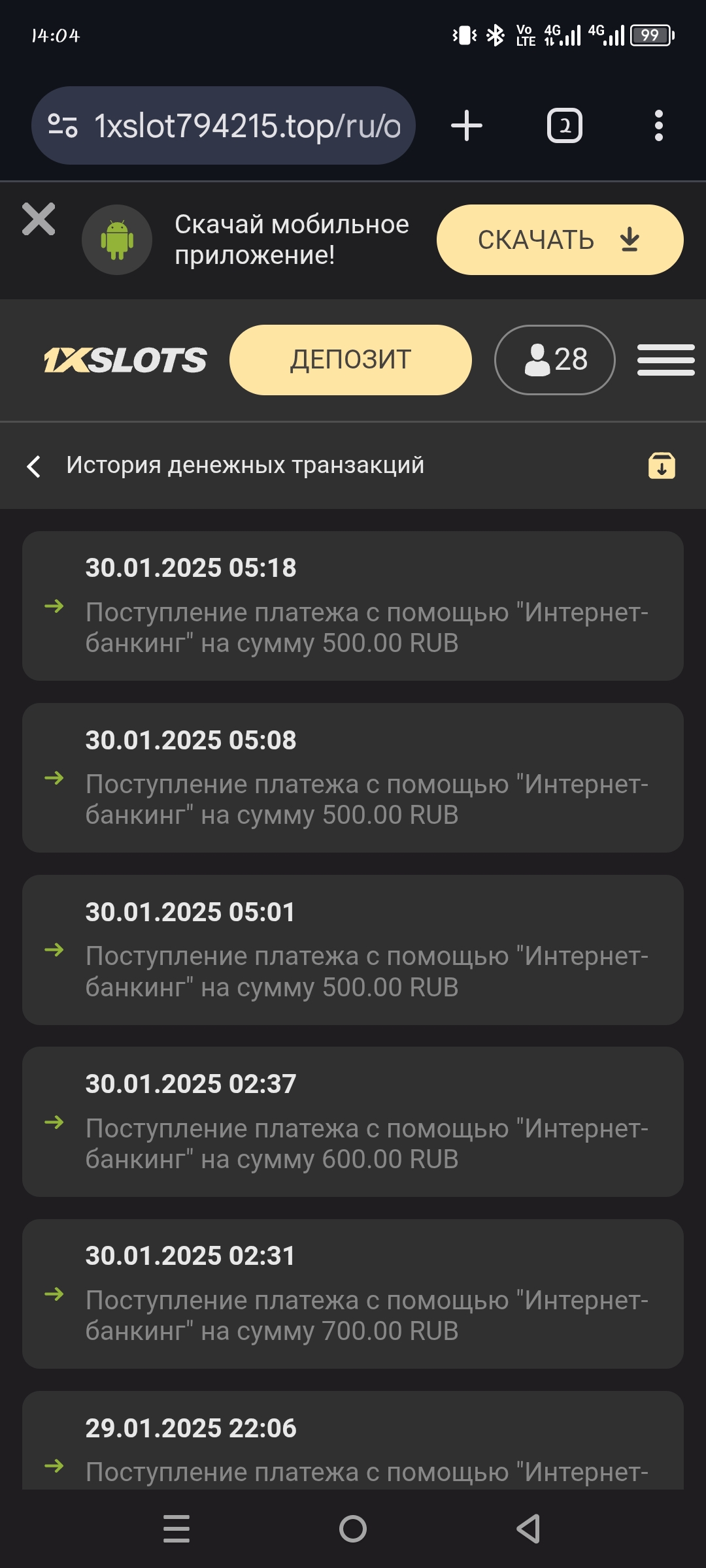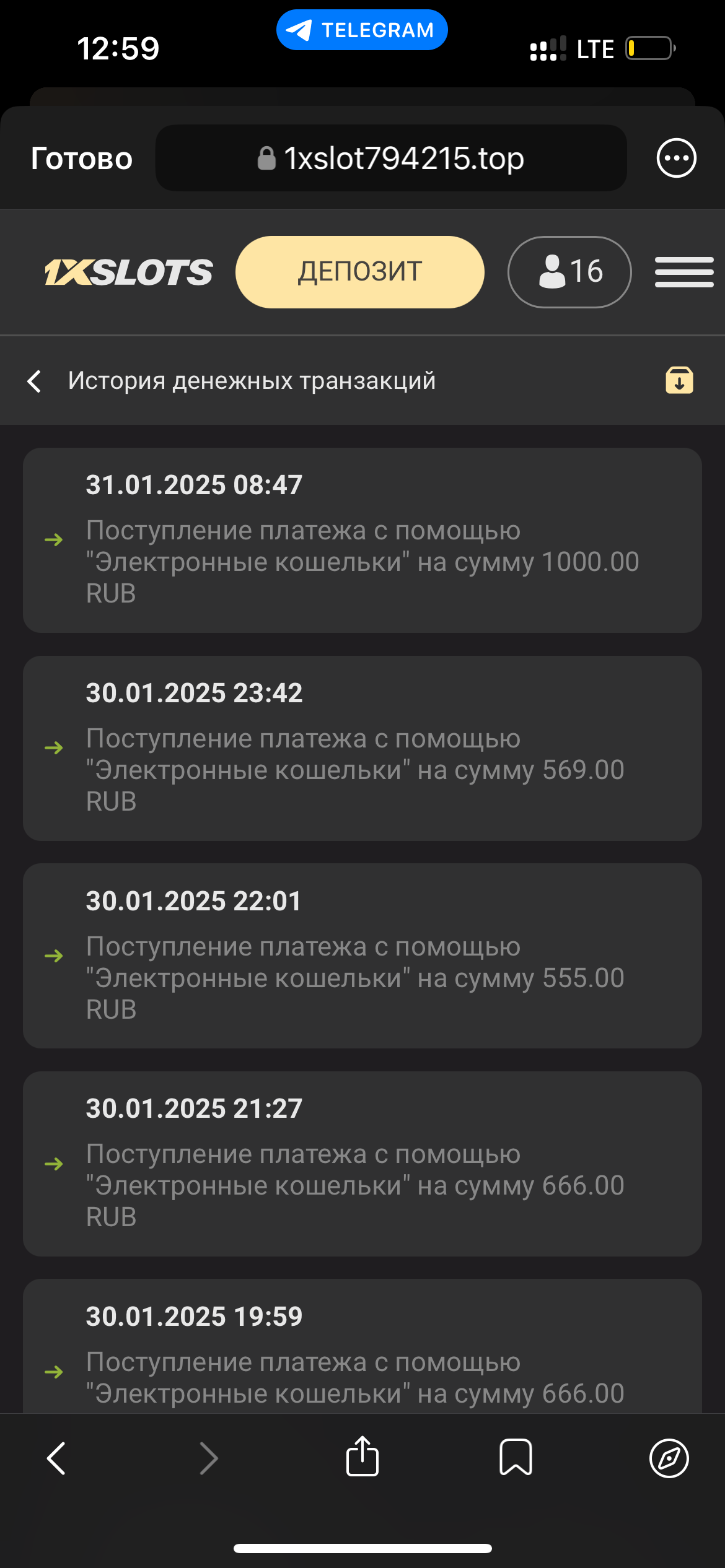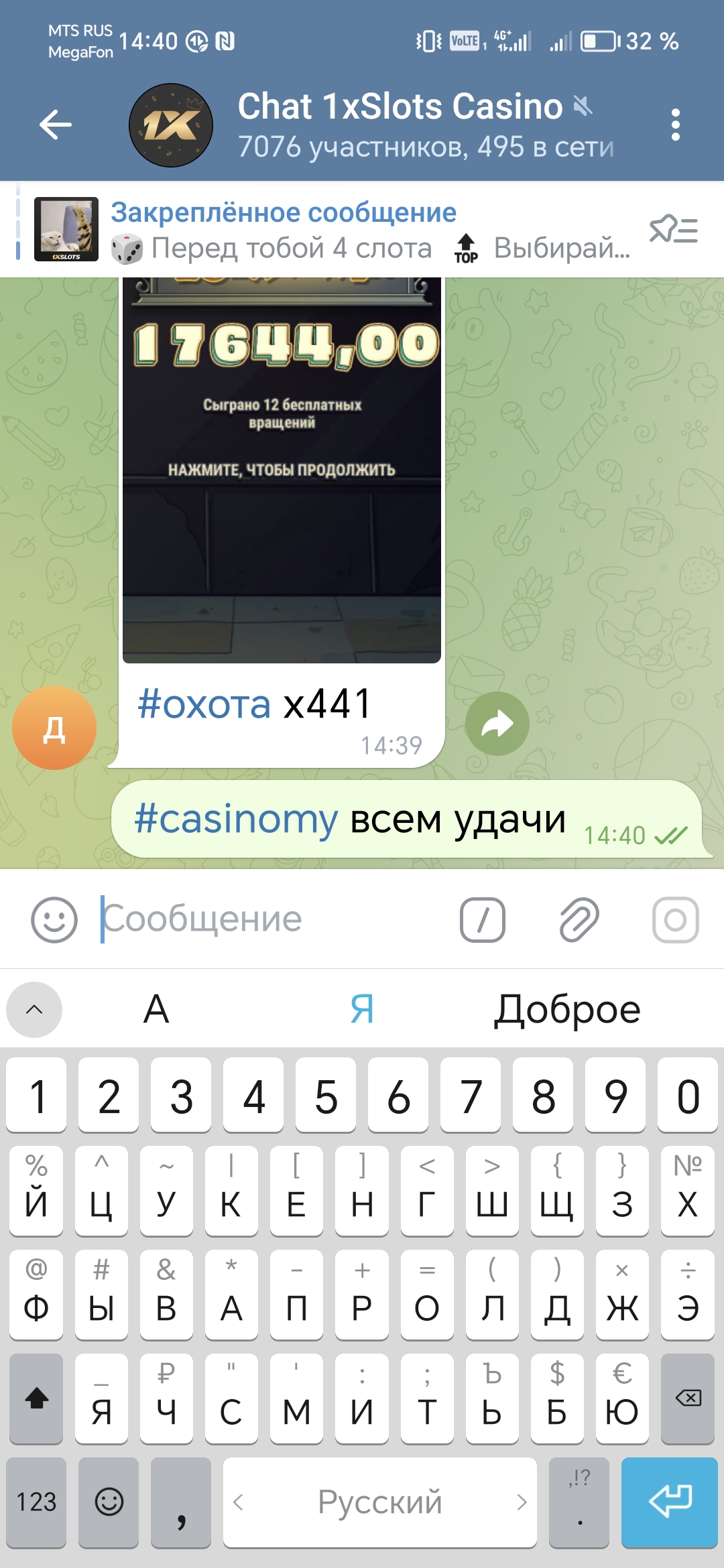 2) Быть подписанным на наш новый форум в телеграмм https://t.me/forumcasinomy, чат https://t.me/casinomyforum и чат казино 1xSlots https://t.me/joinchat/TCG5aNJ_qCpI6SdO, в телеграмм чате 1xSlots https://t.me/joinchat/TCG5aNJ_qCpI6SdO написать любое сообщение с тегом #casinomy и разместить текст этого сообщения в этой теме вместе со скрином депозита.
