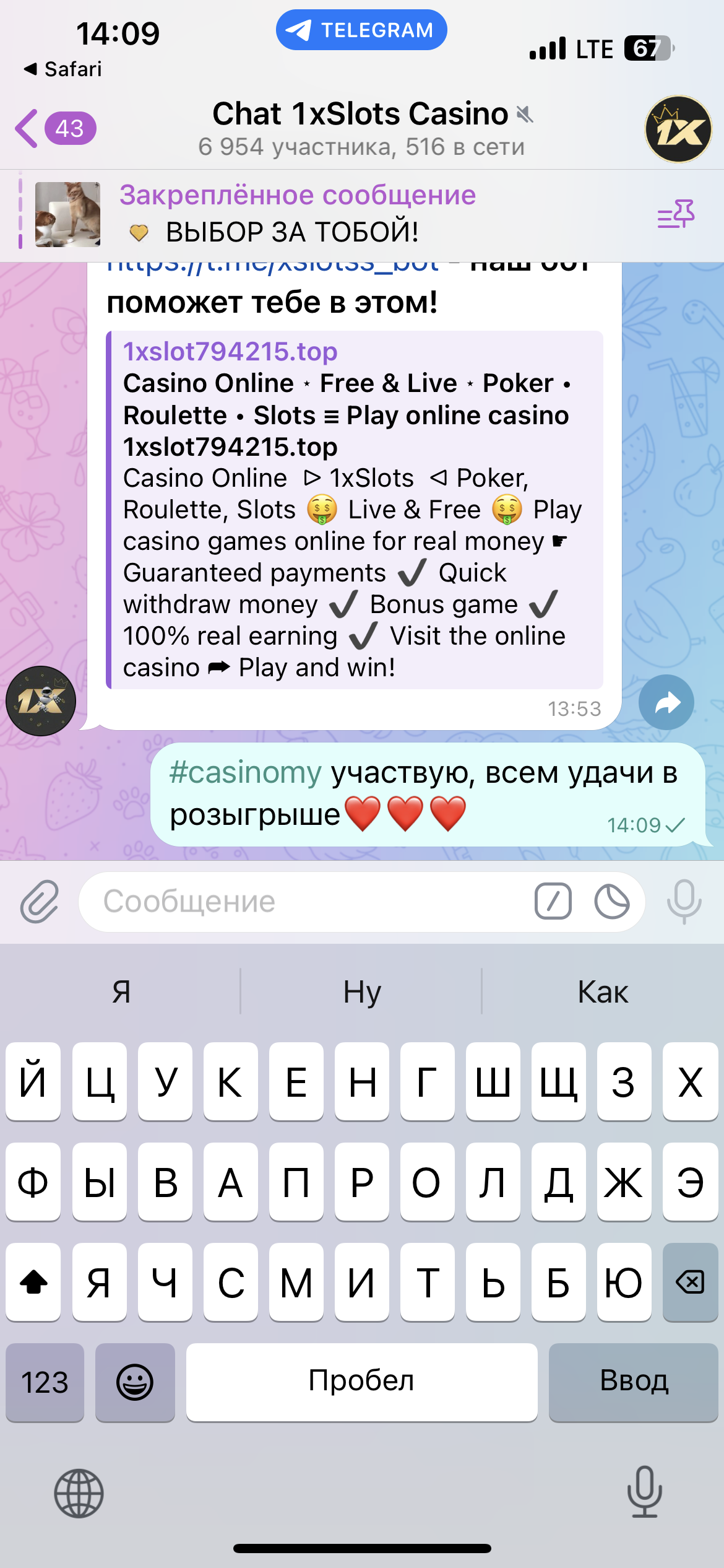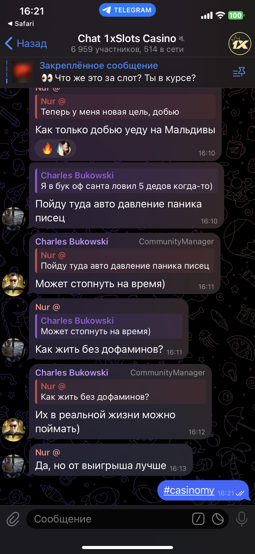 2) Быть подписанным на наш новый форум в телеграмм https://t.me/forumcasinomy, чат https://t.me/casinomyforum и чат казино 1xSlots https://t.me/joinchat/TCG5aNJ_qCpI6SdO, в телеграмм чате 1xSlots https://t.me/joinchat/TCG5aNJ_qCpI6SdO написать любое сообщение с тегом #casinomy и разместить текст этого сообщения в этой теме вместе со скрином депозита.