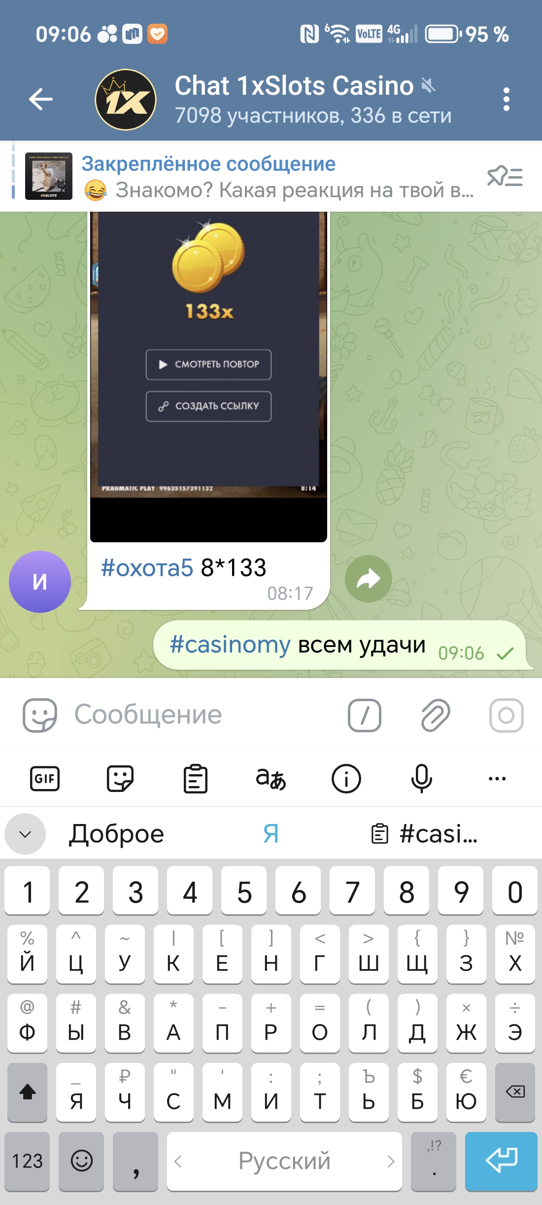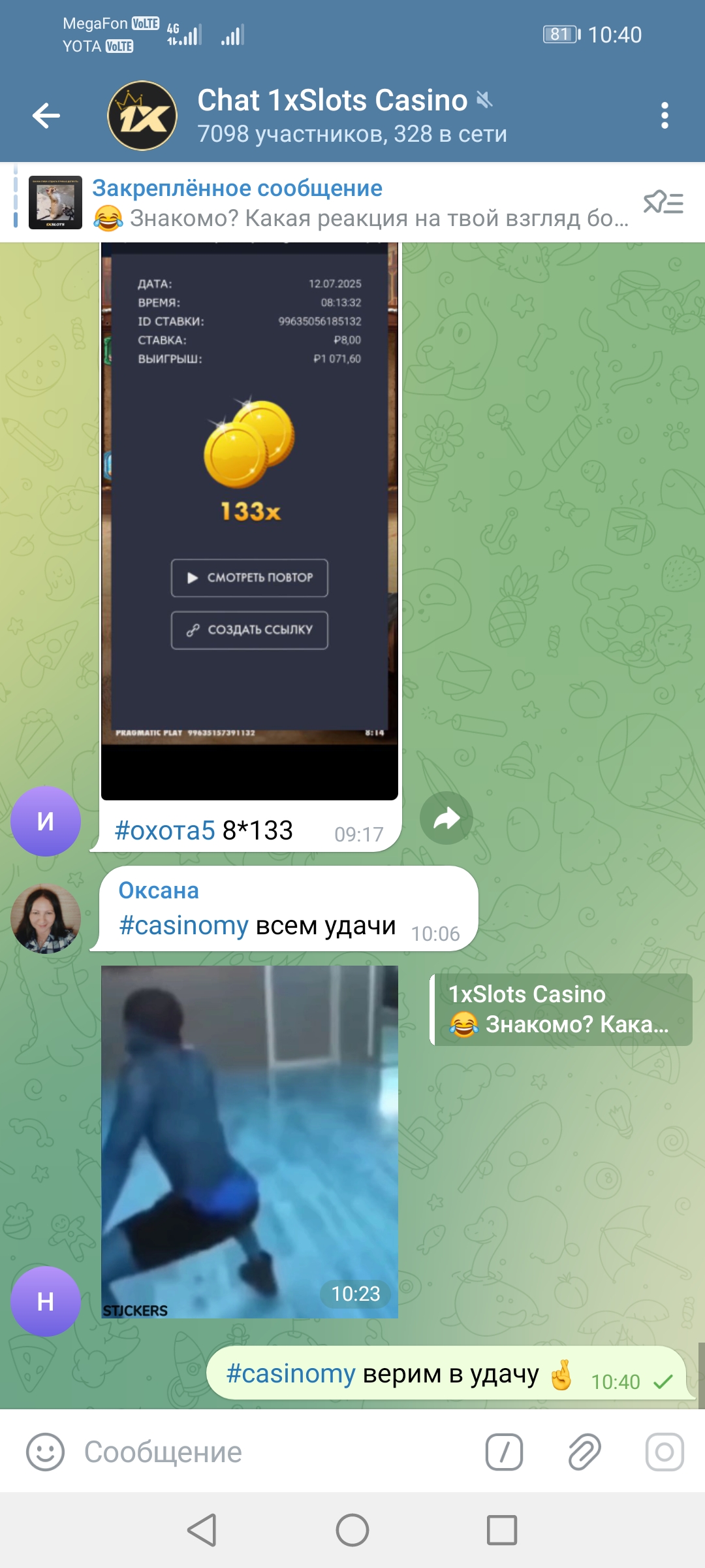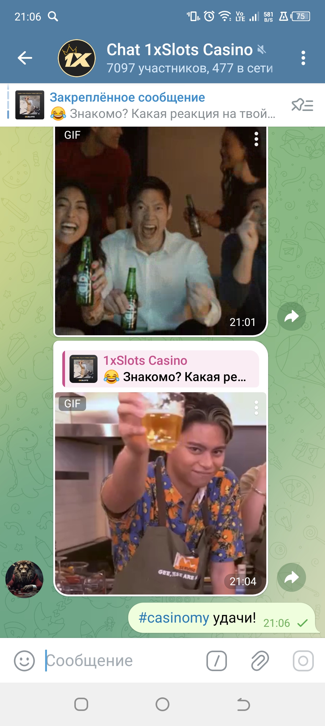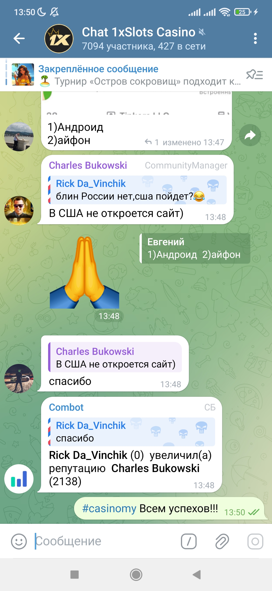 2) Быть подписанным на наш новый форум в телеграмм https://t.me/forumcasinomy, чат https://t.me/casinomyforum и чат казино 1xSlots https://t.me/joinchat/TCG5aNJ_qCpI6SdO, в телеграмм чате 1xSlots https://t.me/joinchat/TCG5aNJ_qCpI6SdO написать любое сообщение с тегом #casinomy и разместить текст этого сообщения в этой теме вместе со скрином депозита.