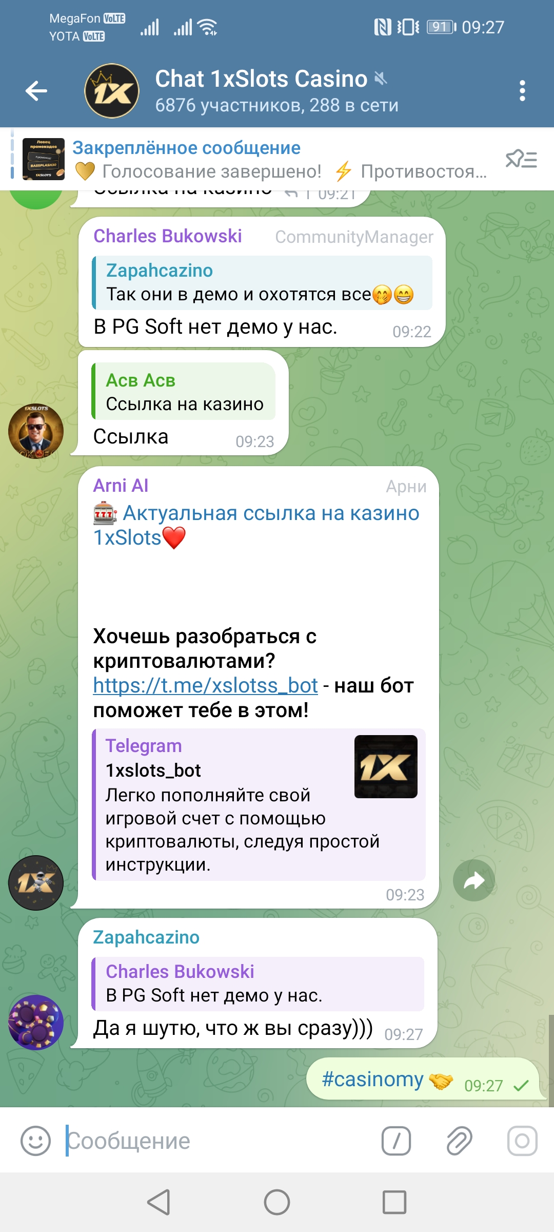 2) Быть подписанным на наш новый форум в телеграмм https://t.me/forumcasinomy, чат https://t.me/casinomyforum и чат казино 1xSlots https://t.me/joinchat/TCG5aNJ_qCpI6SdO, в телеграмм чате 1xSlots https://t.me/joinchat/TCG5aNJ_qCpI6SdO написать любое сообщение с тегом #casinomy и разместить текст этого сообщения в этой теме вместе со скрином депозита.