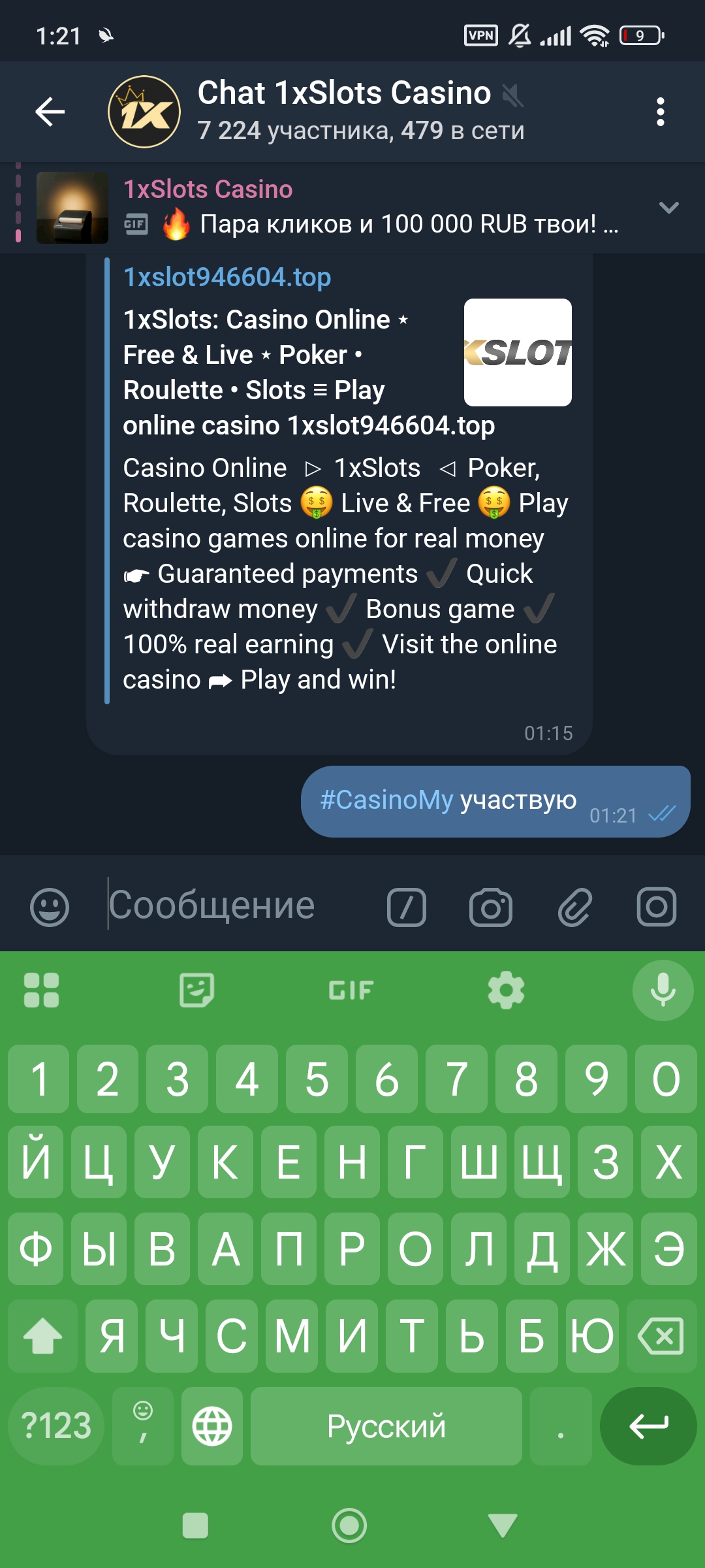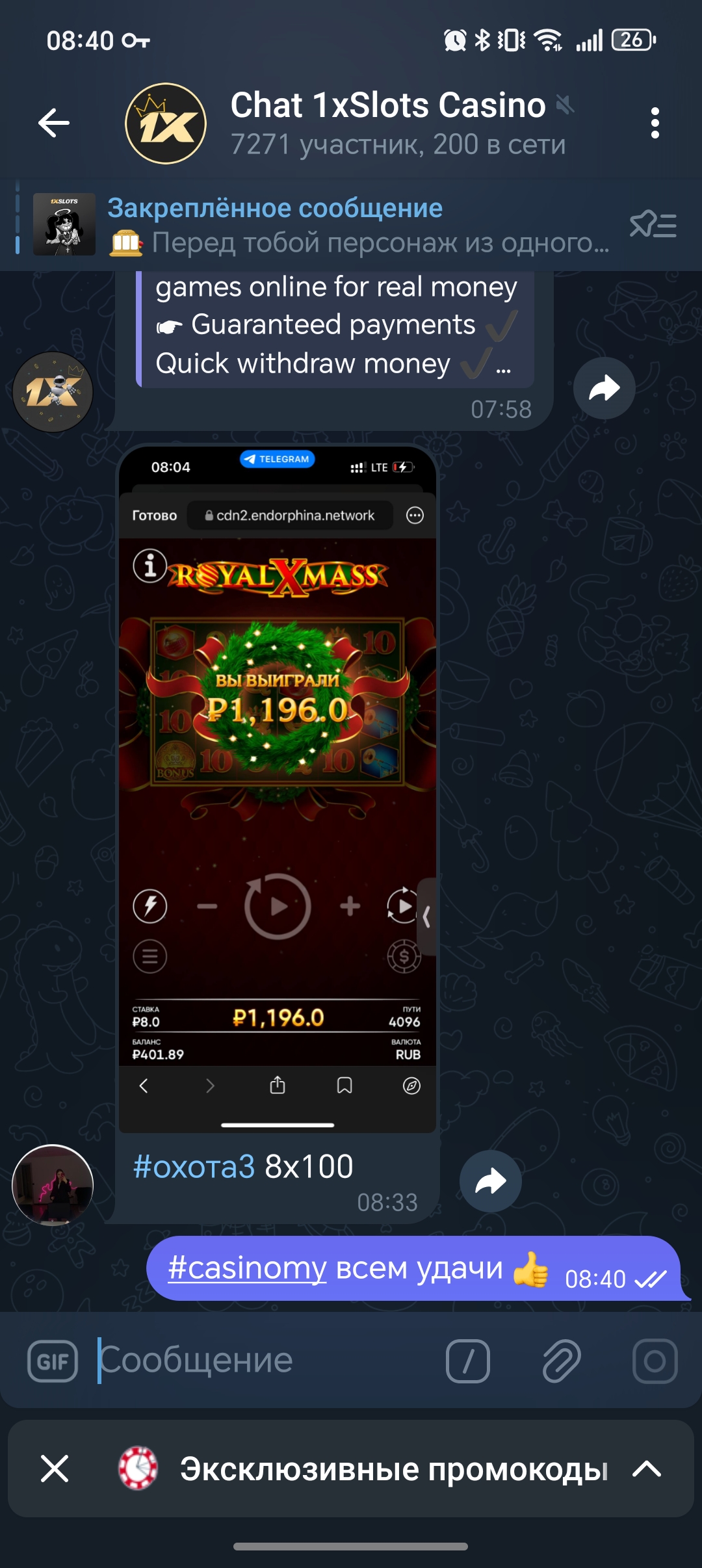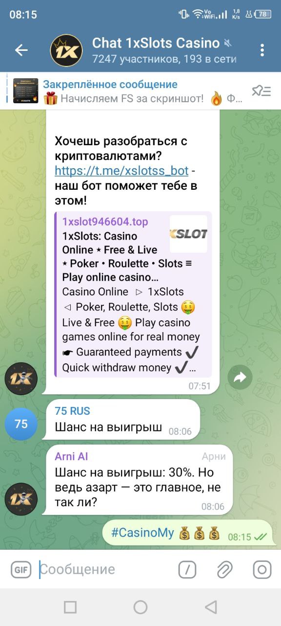 2) Быть подписанным на наш новый форум в телеграмм https://t.me/forumcasinomy, чат https://t.me/casinomyforum и чат казино 1xSlots https://t.me/joinchat/TCG5aNJ_qCpI6SdO, в телеграмм чате 1xSlots https://t.me/joinchat/TCG5aNJ_qCpI6SdO написать любое сообщение с тегом #casinomy и разместить текст этого сообщения в этой теме вместе со скрином депозита.