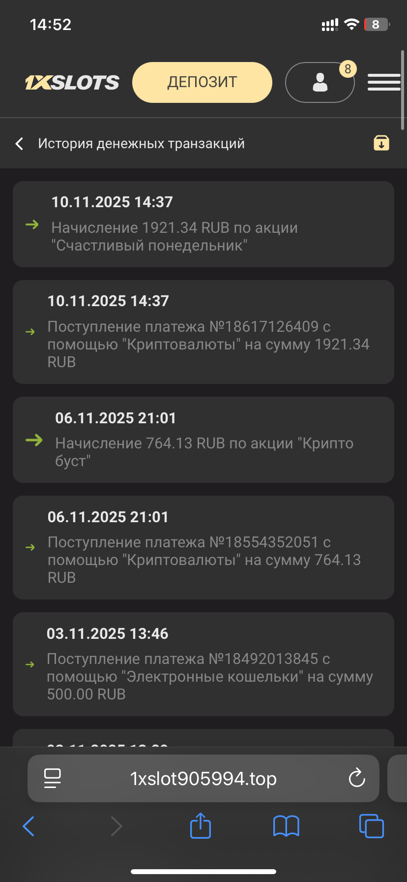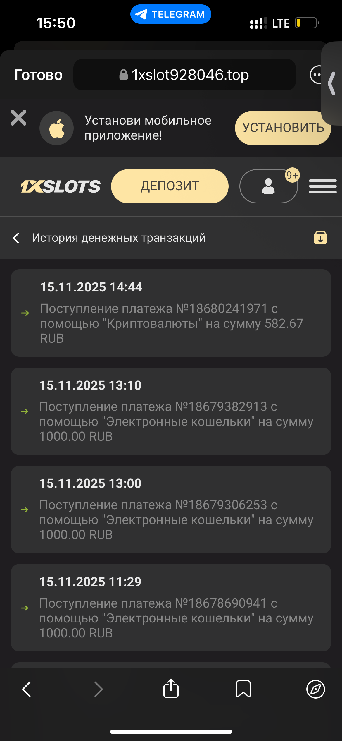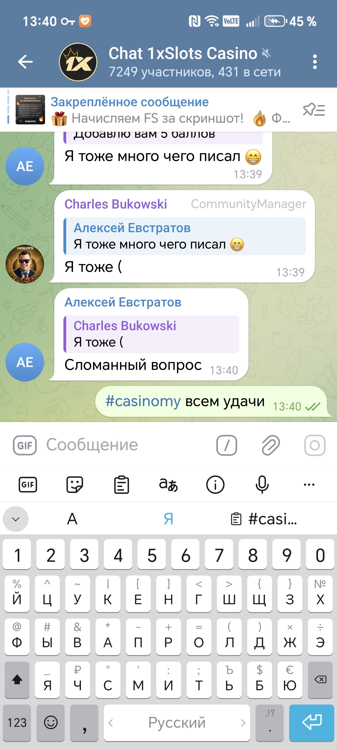 2) Быть подписанным на наш новый форум в телеграмм https://t.me/forumcasinomy, чат https://t.me/casinomyforum и чат казино 1xSlots https://t.me/joinchat/TCG5aNJ_qCpI6SdO, в телеграмм чате 1xSlots https://t.me/joinchat/TCG5aNJ_qCpI6SdO написать любое сообщение с тегом #casinomy и разместить текст этого сообщения в этой теме вместе со скрином депозита.
