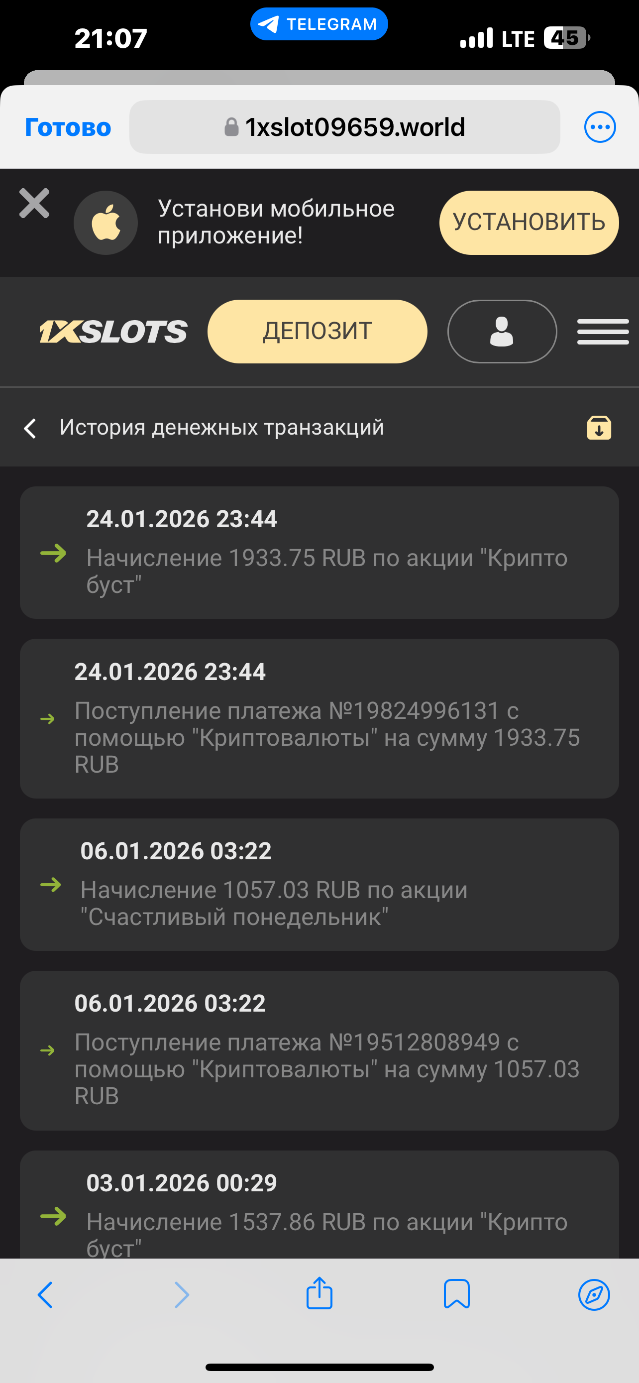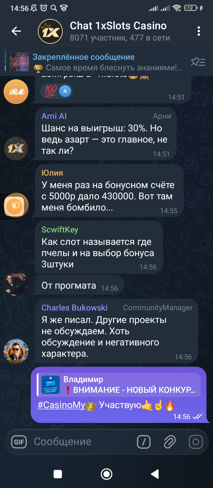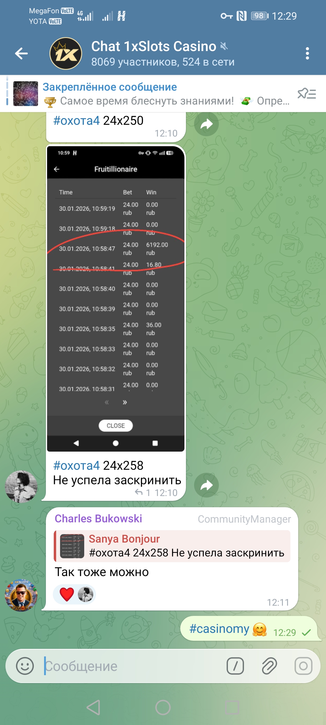 2) Быть подписанным на наш новый форум в телеграмм https://t.me/forumcasinomy, чат https://t.me/casinomyforum и чат казино 1xSlots https://t.me/joinchat/TCG5aNJ_qCpI6SdO, в телеграмм чате 1xSlots https://t.me/joinchat/TCG5aNJ_qCpI6SdO написать любое сообщение с тегом #casinomy и разместить текст этого сообщения в этой теме вместе со скрином депозита.