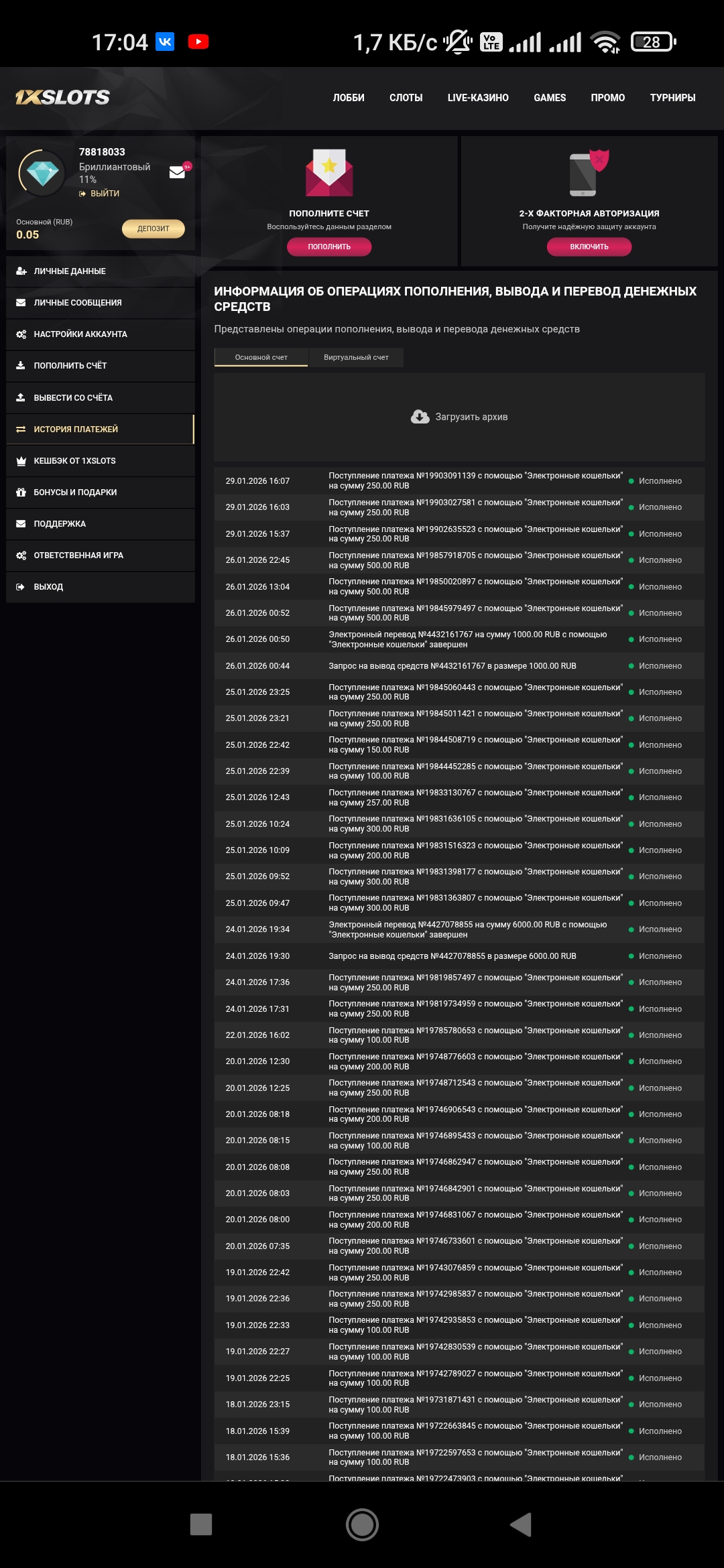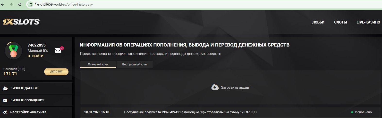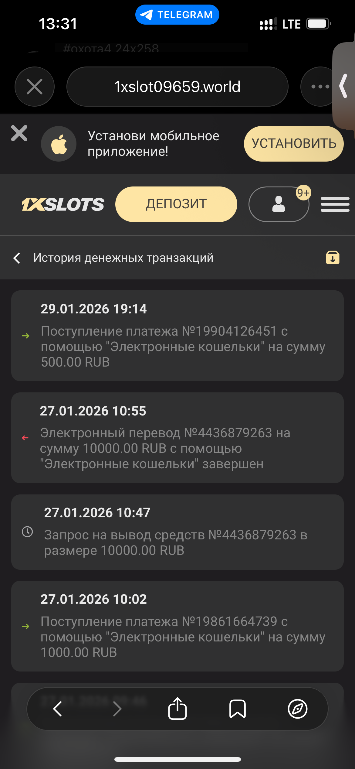 2) Быть подписанным на наш новый форум в телеграмм https://t.me/forumcasinomy, чат https://t.me/casinomyforum и чат казино 1xSlots https://t.me/joinchat/TCG5aNJ_qCpI6SdO, в телеграмм чате 1xSlots https://t.me/joinchat/TCG5aNJ_qCpI6SdO написать любое сообщение с тегом #casinomy и разместить текст этого сообщения в этой теме вместе со скрином депозита.