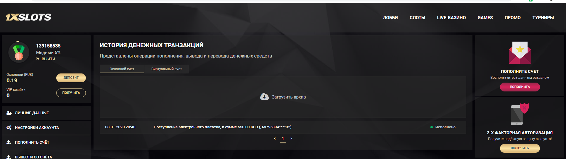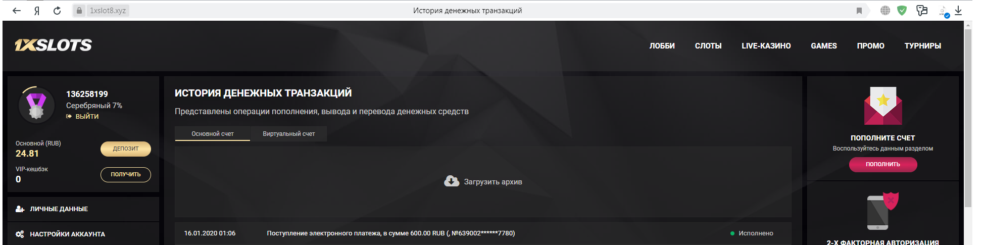 где видно логотип казино, номер счета, дата и сумма депозита и статус платежа Исполнено! С телефона скрины не принимаются, на них не видно номер счета!