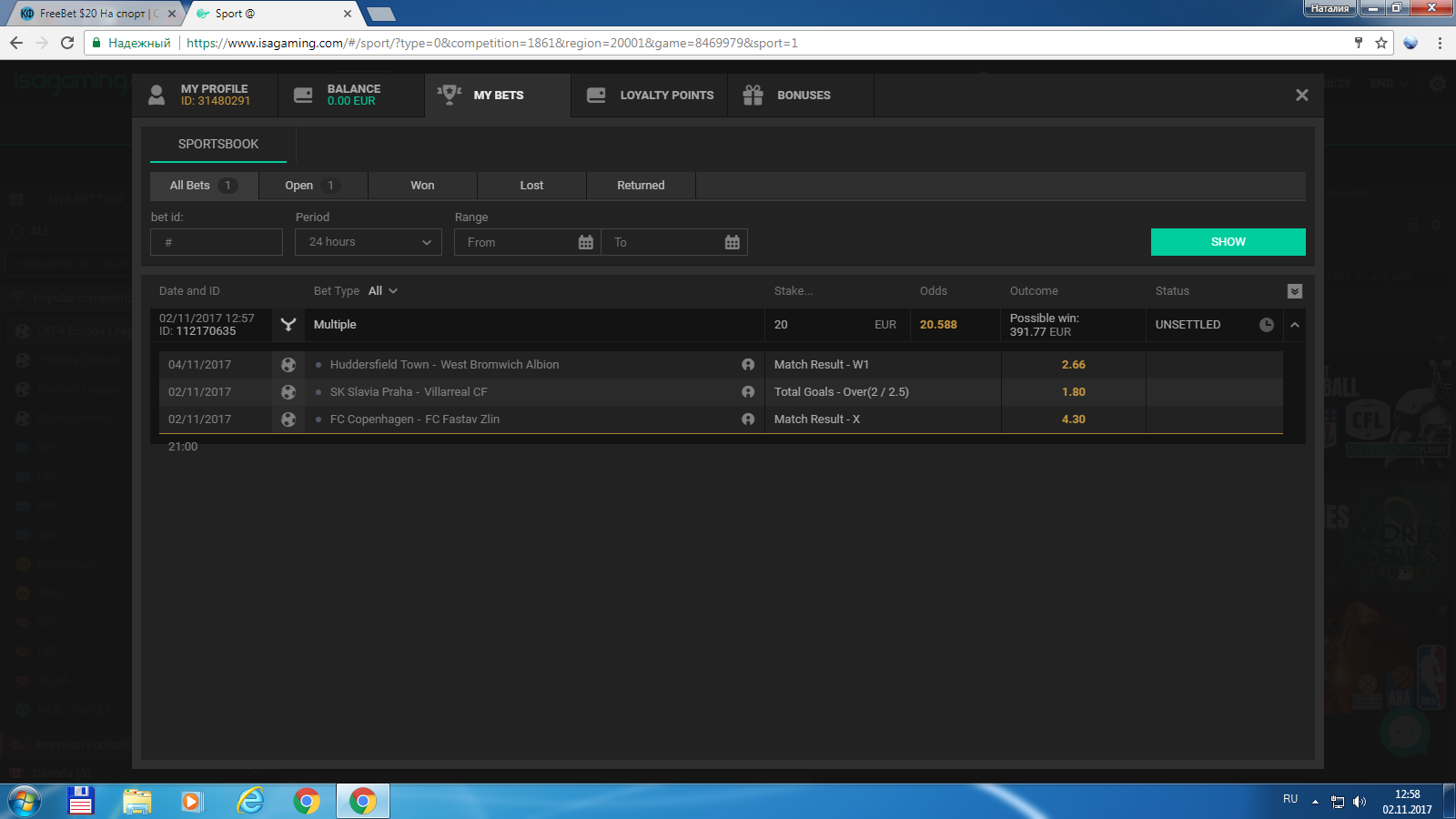 Действительно нужно было просто экспресс из минимум трех событий с кефом 1.5 выше поставить и фрибет зашел на ура. Жаль вчера не догнали как его ставить )) Ну ничего , уже поставил на сегодня , собрал экспресс из 5-ти событий , если повезёт то 312 баксов прилетит. Уверен на 70 % что зайдет а там кто его знает. Буду надеяться )) Всем удачи в этом не лёгком деле ))