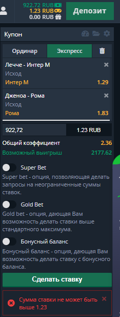 А в экспресс более 2,5 кеф нельзя ставить более 1,23р за раз? Или я что то не так делаю? Можно как то проставить всю сумму сразу?