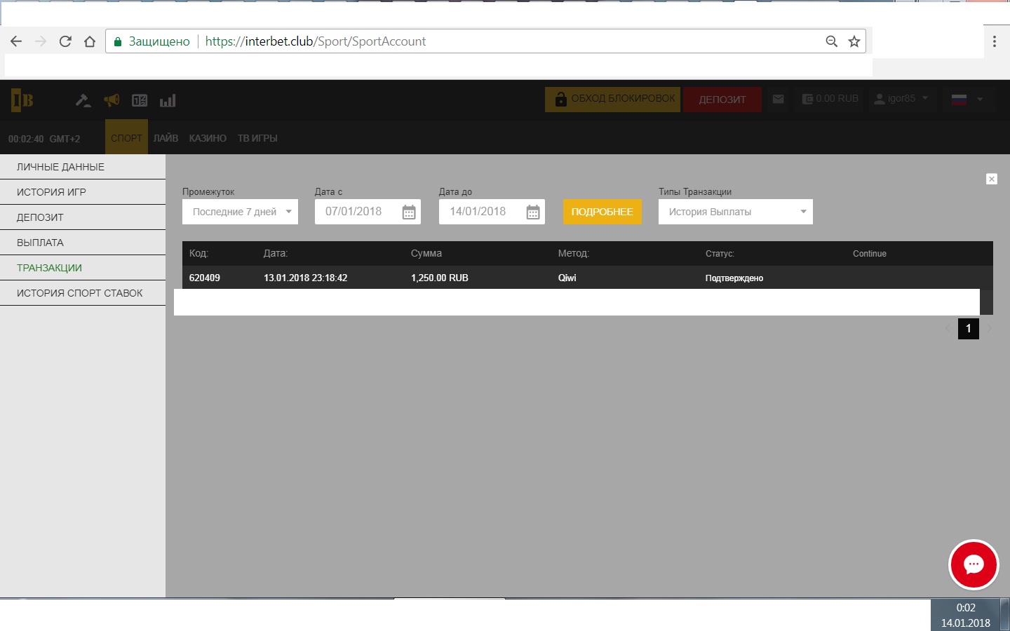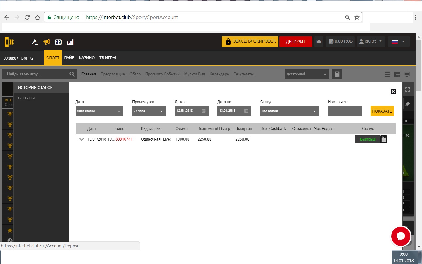 фрибет получен без проблем вчера.пробил Евролигу и вместо того чтобы вывести поставил лайв баскет.мои ведут 5 очков за три минуты до конца и...сливаются.ладно.ставлю теннис.мой с бScreenshot_2018-01-13-15-05-13.jpeg рейком ведёт и....сливается...в общем я в ах.....если учесть,что сегодня ещё не отмыл в балтбете фрибет в ППС 3000,то пора сделать паузу в ставках..))