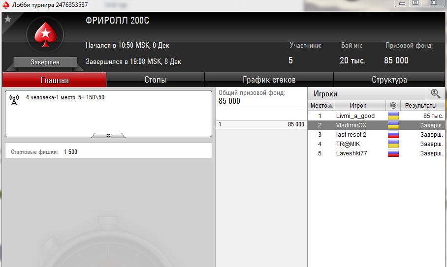 2 места от 5 человек. См скрин турнира выше, левый верхний угол. 150 тебе первел, Велес тебе полтинник) Все молодцы, я проспал. Завтра еще сыграем. Тяните своих друзей покеристов, будет больше народа- повысим гарантии.Так призовое одно![]()
