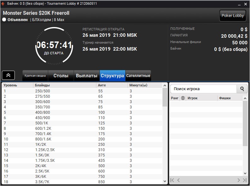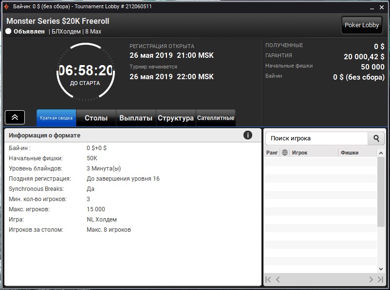 Название турнира: Monster Series $20K Freeroll