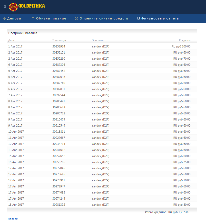 Я: 1715р депозита ежедневно