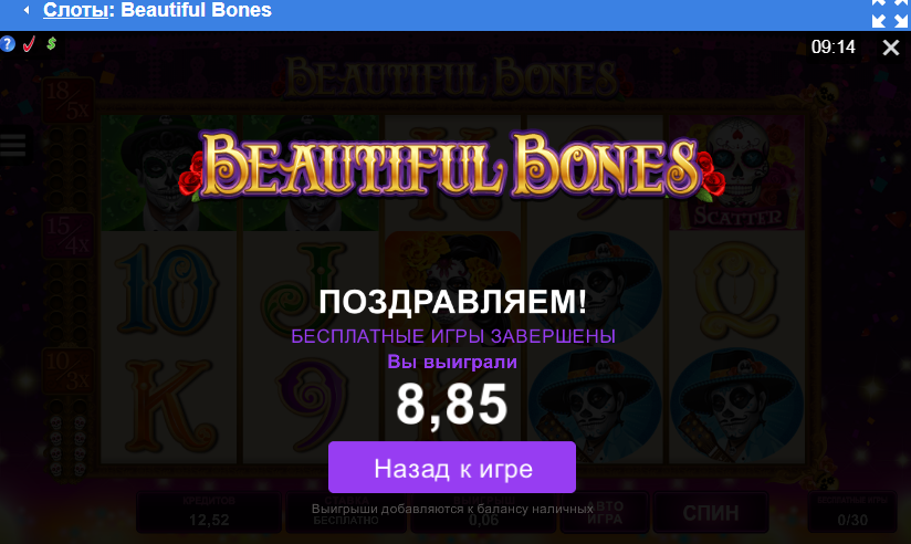 30 спинов по ставке 12 рублей за депозит 3000 рублей в Beautiful Bones