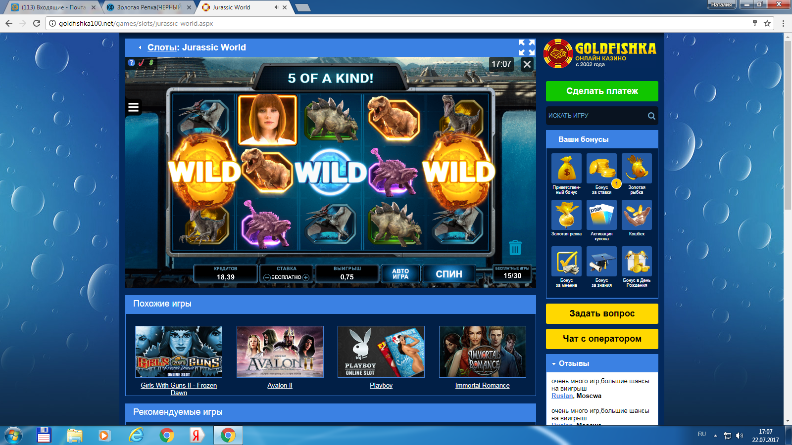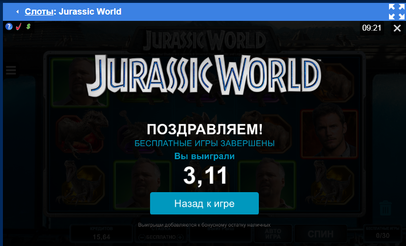 25 спинов по ставке 6 рублей за депозит 1500 рублей в Jurassic World