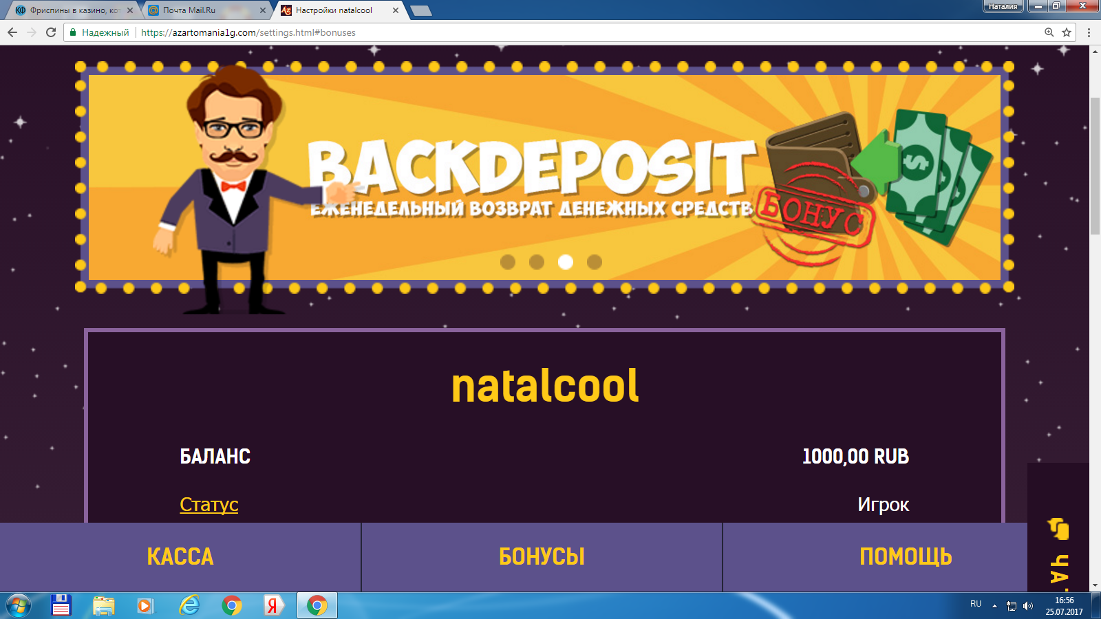 1000 рублей за регистрацию по ссылке http://3h54ls2.com/alt/azartmania/registration.html?2480b98ef1c2bc968cff2ff9cda36bff надо заполнить профиль, подтвердить номер телефона и написать в лайф-чат кодовое слово 1000RUBASOV