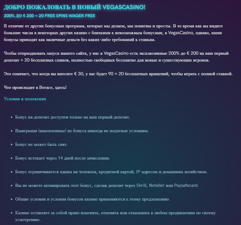 Чтобы отпраздновать запуск нашего сайта, у нас в VegasCasino есть эксклюзивные 200% до € 200 на ваш первый депозит + 20 бесплатных спинов, полностью свободных бесплатно для новых и существующих игроков.