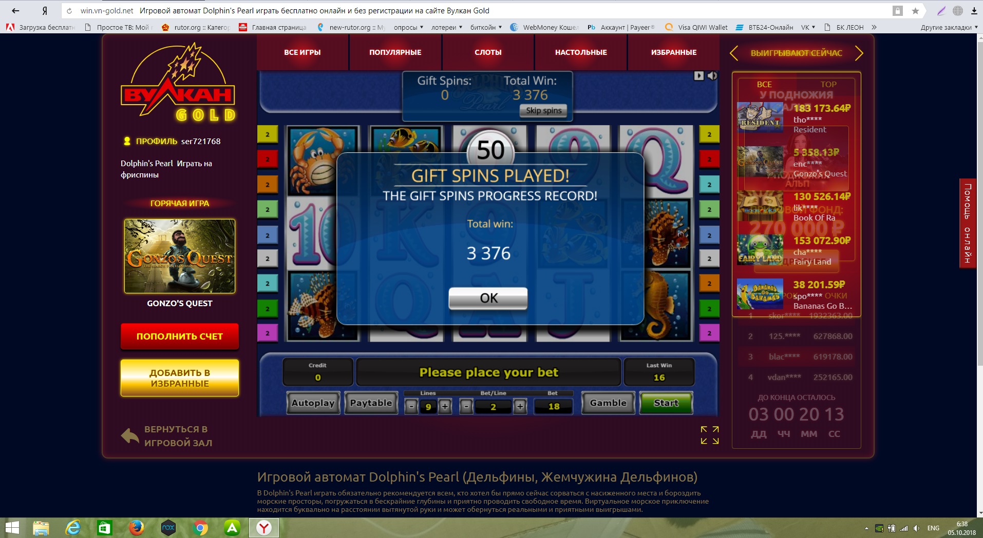 50 фриспинов в Dolphin's Pearl по 18р, после подтверждения почты и телефона активировать в личном кабинете