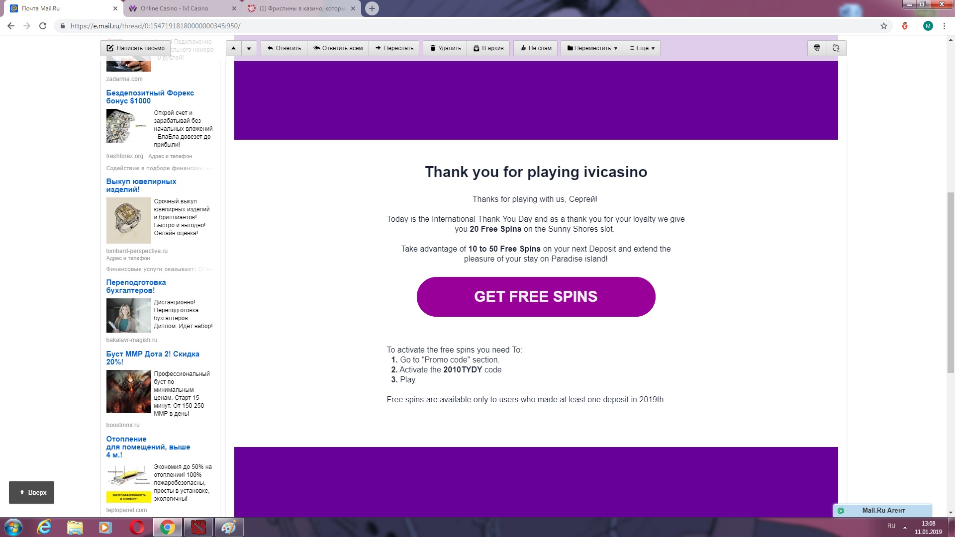 Бесплатные спины истекают 9 января 2019 года