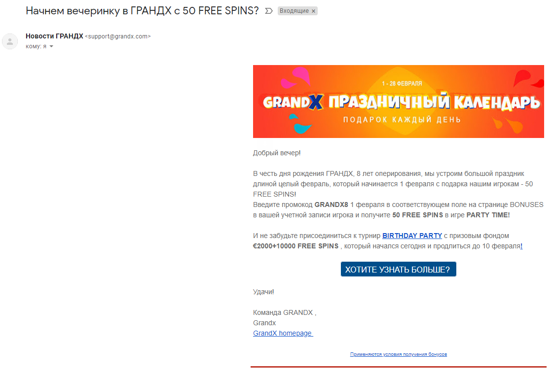 Акции будет весь февраль (и раздача фри спинов, и cahsback, и бонусы на депозиты.Каленарь акций - https://www.grandx.com/ru/akcii/birthday/) но только для игроков, которые депозитят. Сорян