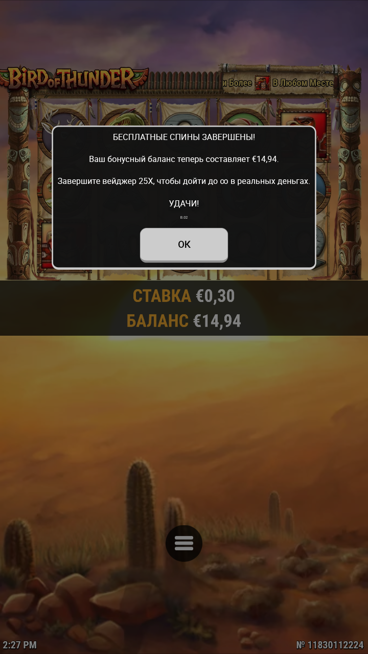 Проверяйте аккаунты.. Письмо от Evobet пришло с 10тью фриспинами по 0,30 центов в слоте Bird of Thunder .. Насыпало почти 15 евро... Вейджер х25