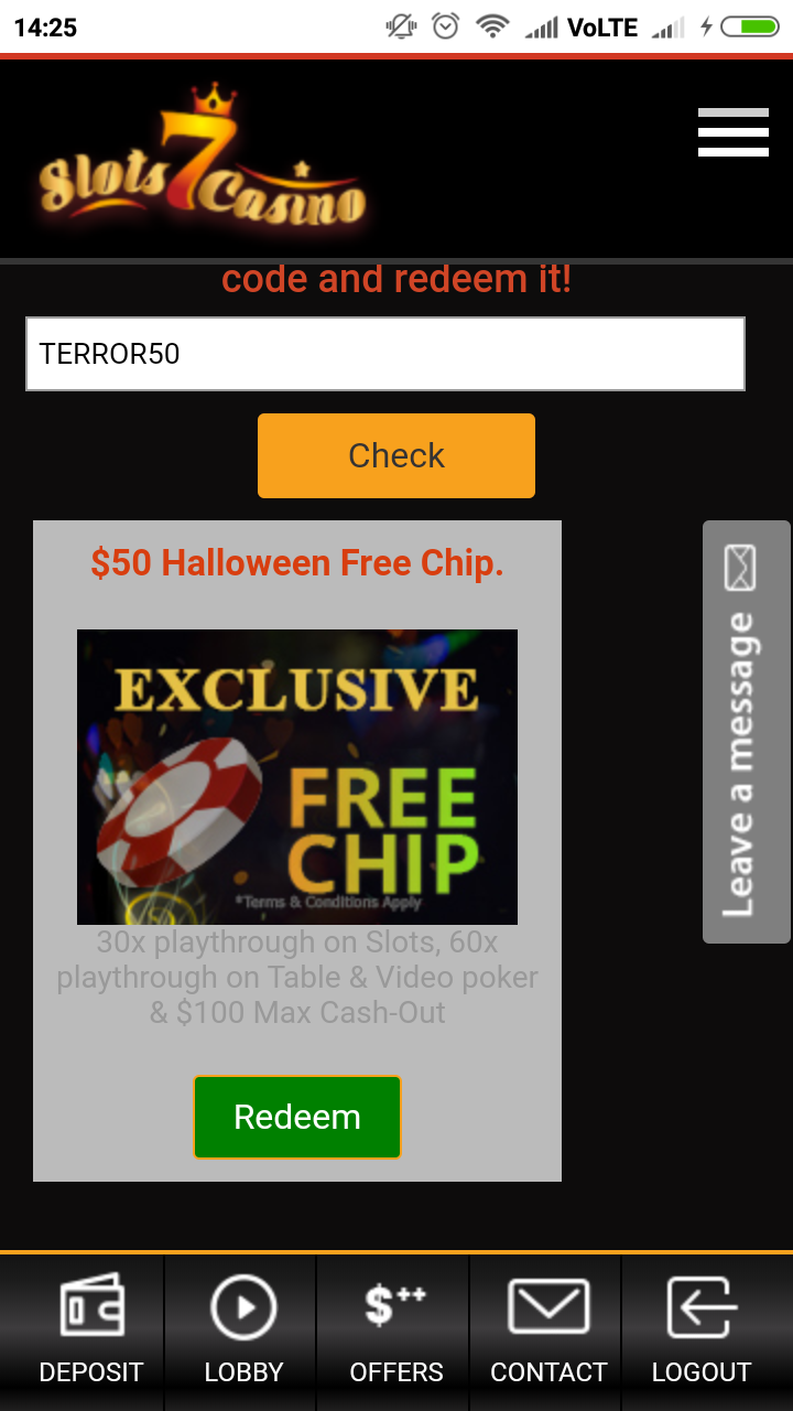 Добавлю, по проиграшу этих 50$, если конечно вы новорег, можно получить еще 100$ по промокоду FREE100.Кому интересно или по нраву подобные заведения, то в казино https://www.slots7casino.mobi по промокоду TERROR50 предоставляют $50 с вагером х30....