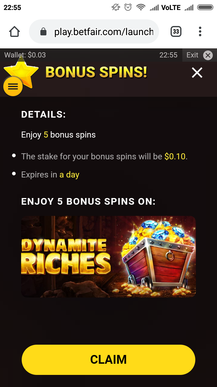 Сегодня в Betfair тоже есть 5 фриспинов в Dynamite Riches.