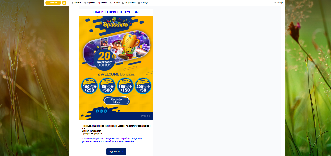 Для того, чтобы претендовать на 20 фунтов стерлингов Нет депозит бонус, вам нужно отправить по электронной почте с темой "No 20 Нет депозит бонус", чтобы [email protected] с вашим зарегистрированным адресом электронной почты на Spassino. https://m.spassino.com/en/account/bonuses