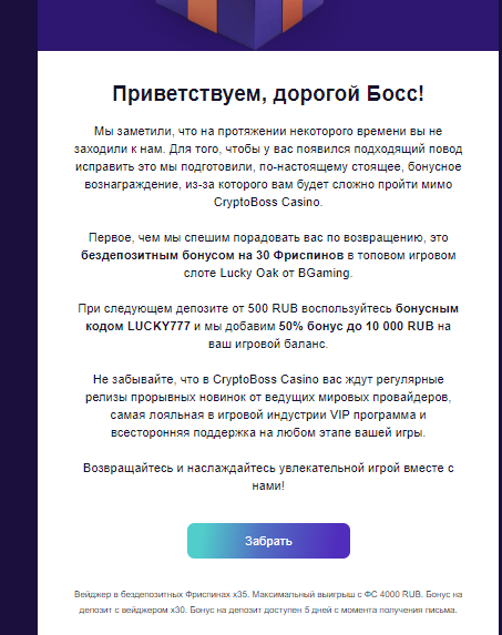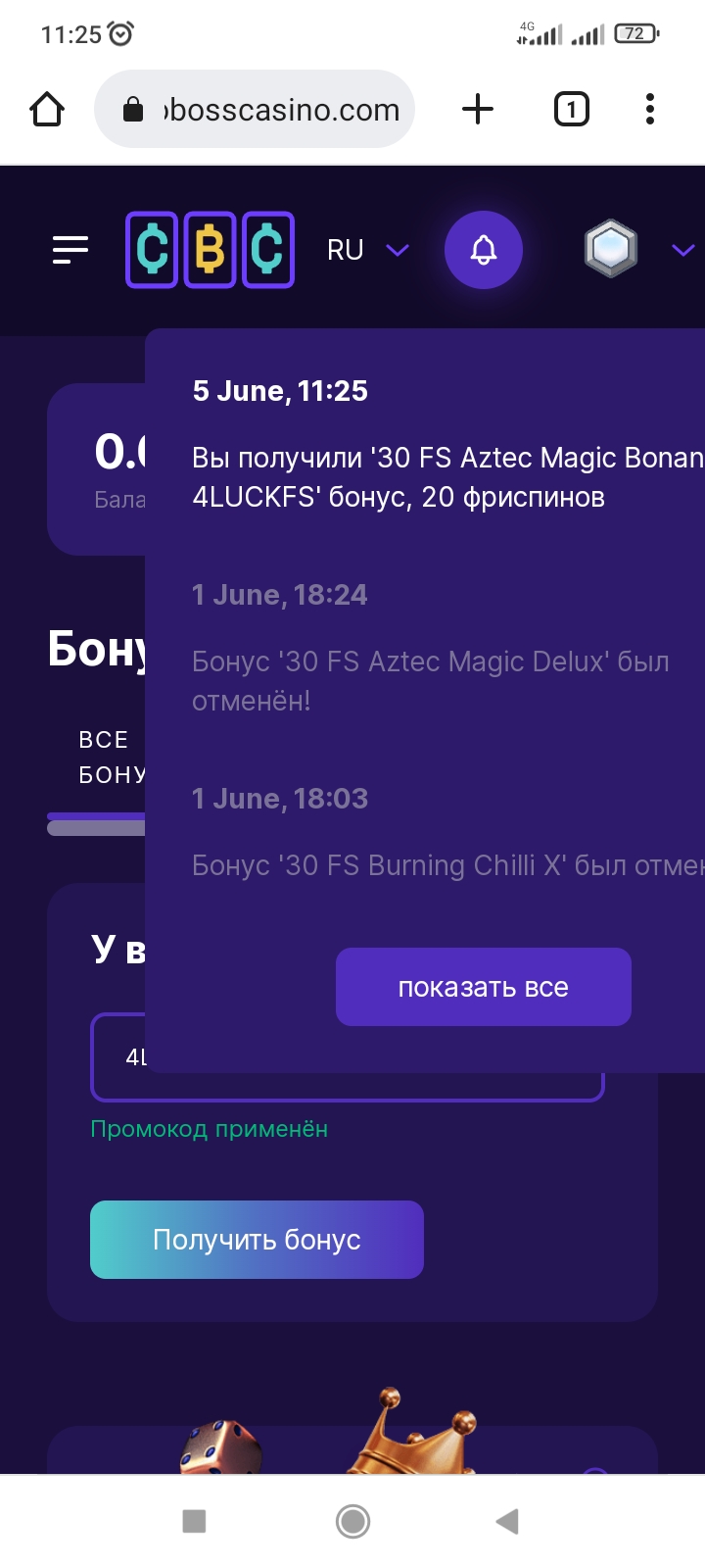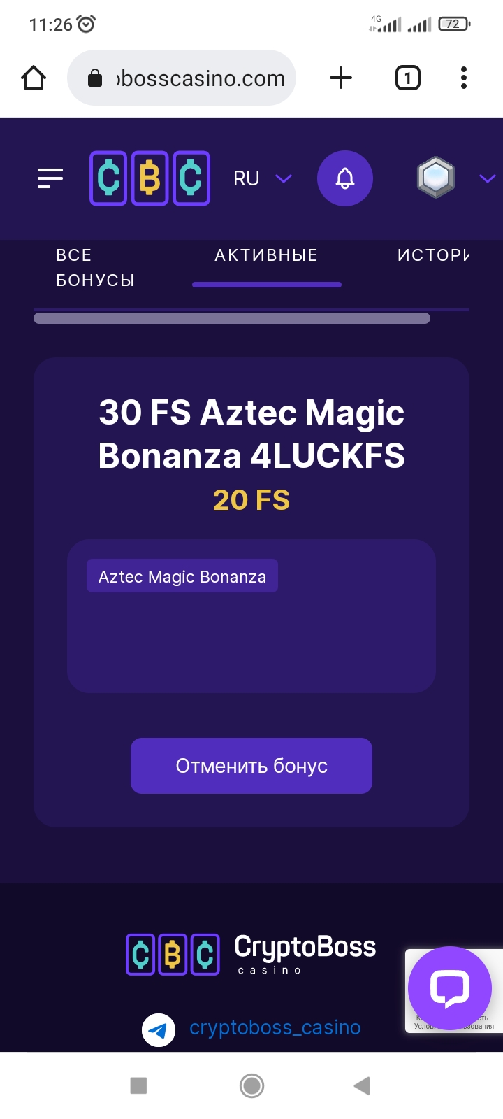 Crypto Boss Casinо бонус код 4LUCKFS Хз. Может глюгк, но у меня сработал Но у меня почему-то 20 спинов, хотя в профиле показывает ,что 30