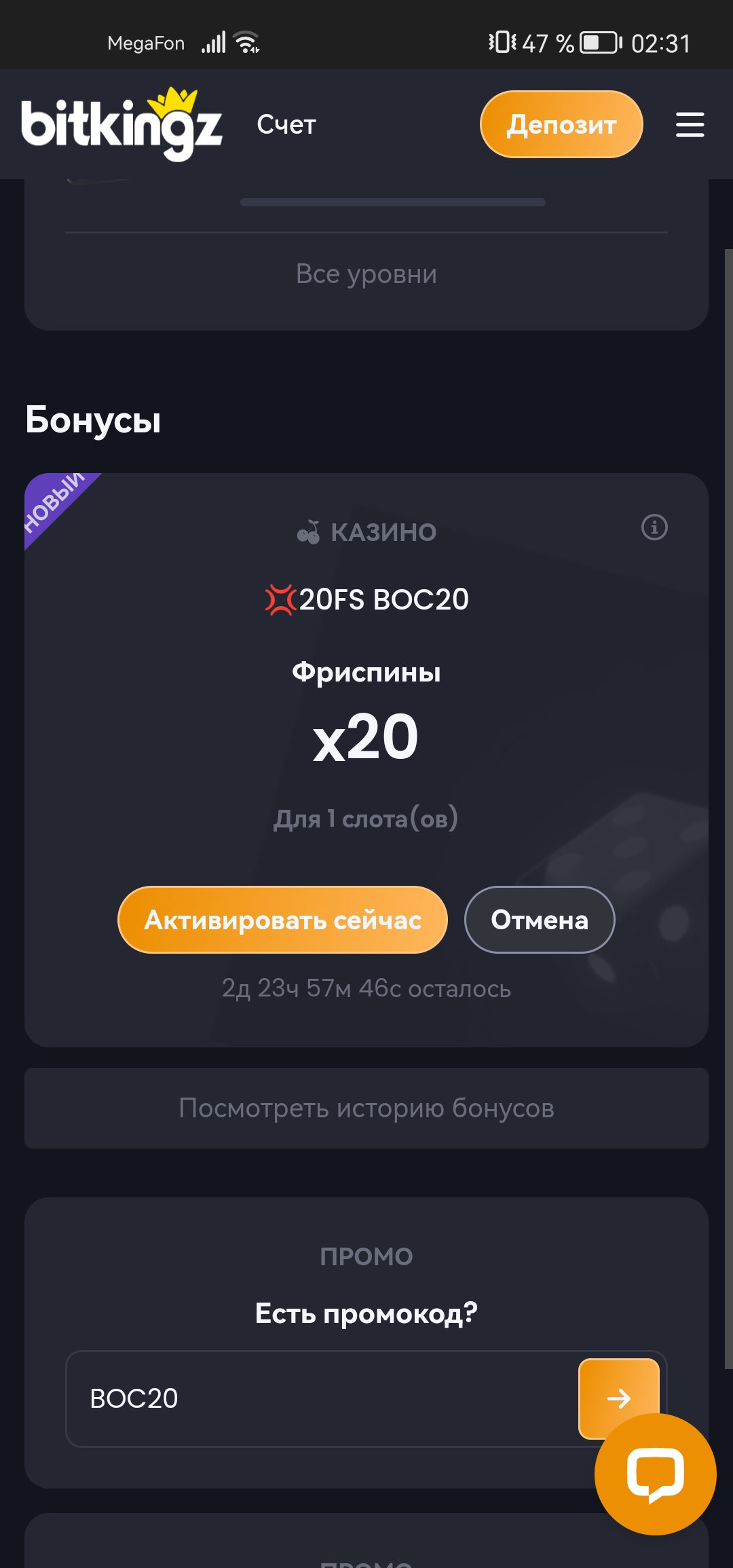 Bitkings 20 фриспинов на бонусные