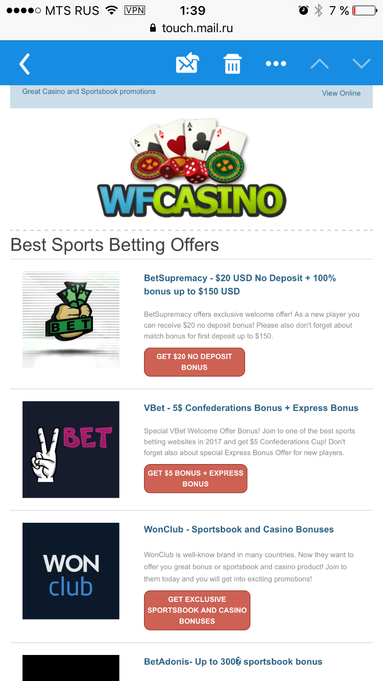 Народ мне тут письмо на почту пришло типа с бездепом на 20$.Но я его открыть не могу с телефона,проверьте казину у кого есть время