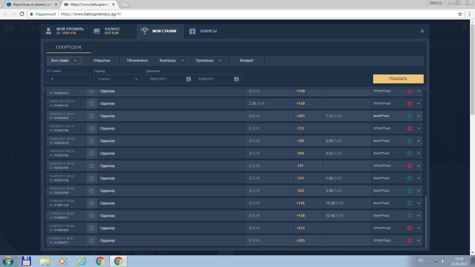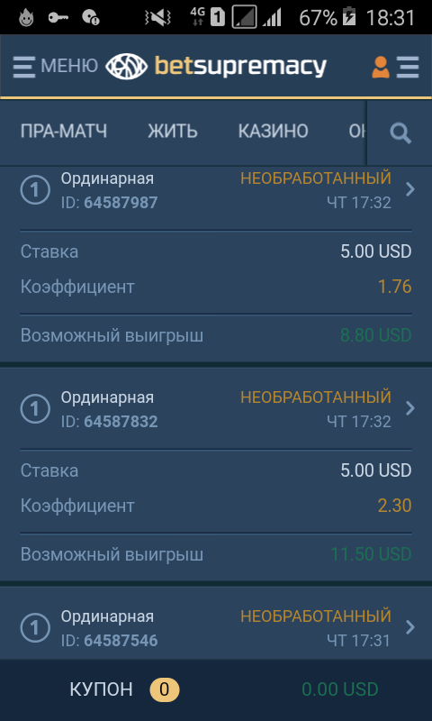 Так же поставил на шару 4 ординара по 5$ мои еще события не сыграли. Наташа у тебя что не одна не сыграла ставка?:( п.с случайно получилось повторы скрины.