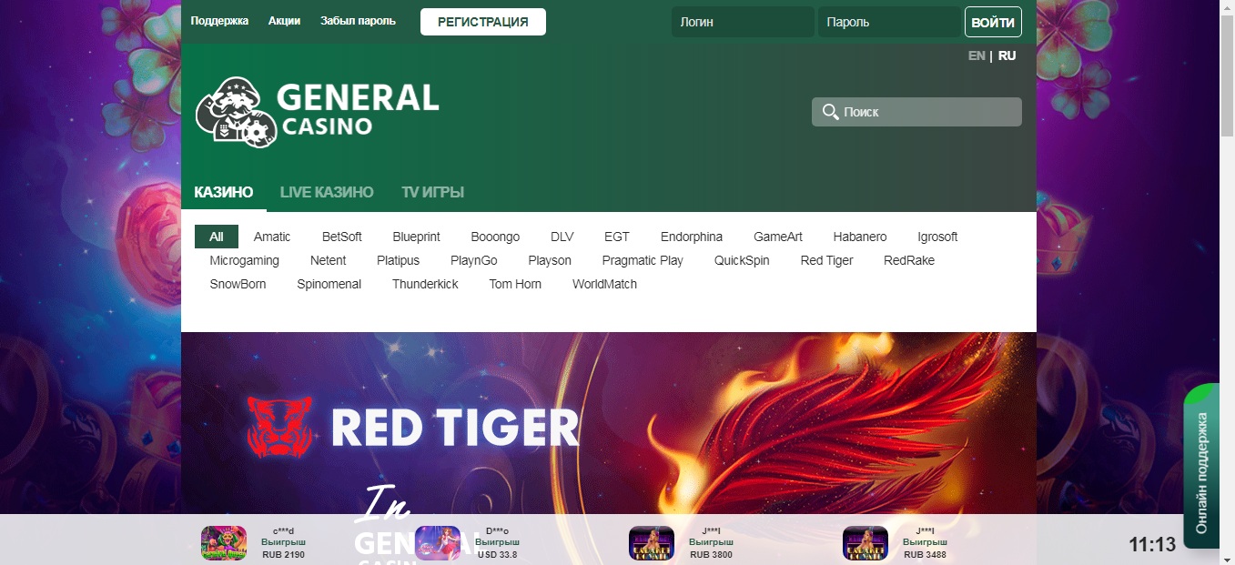 General Casino - онлайн казино, основанное в 2019 году. Казино предоставляет поклонникам виртуальных азартных игр широкий ассортимент игр от всемирно известных провайдеров.