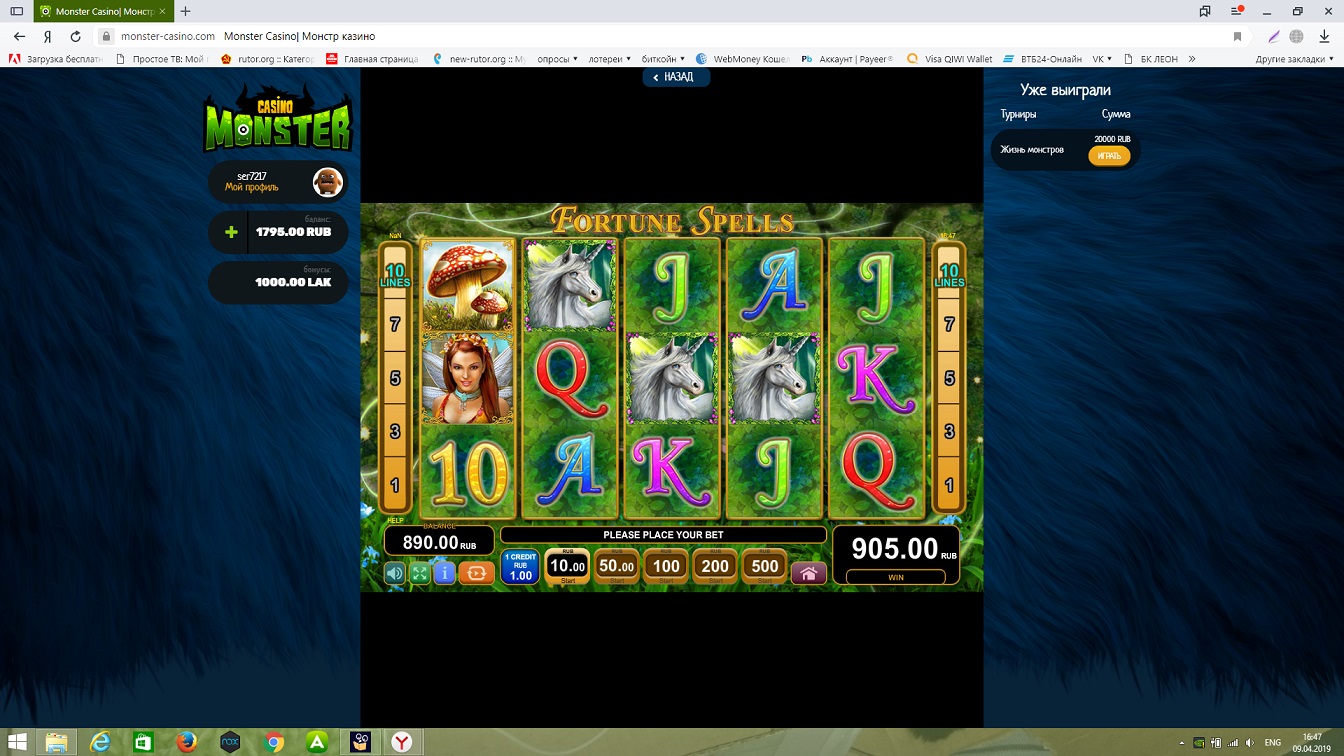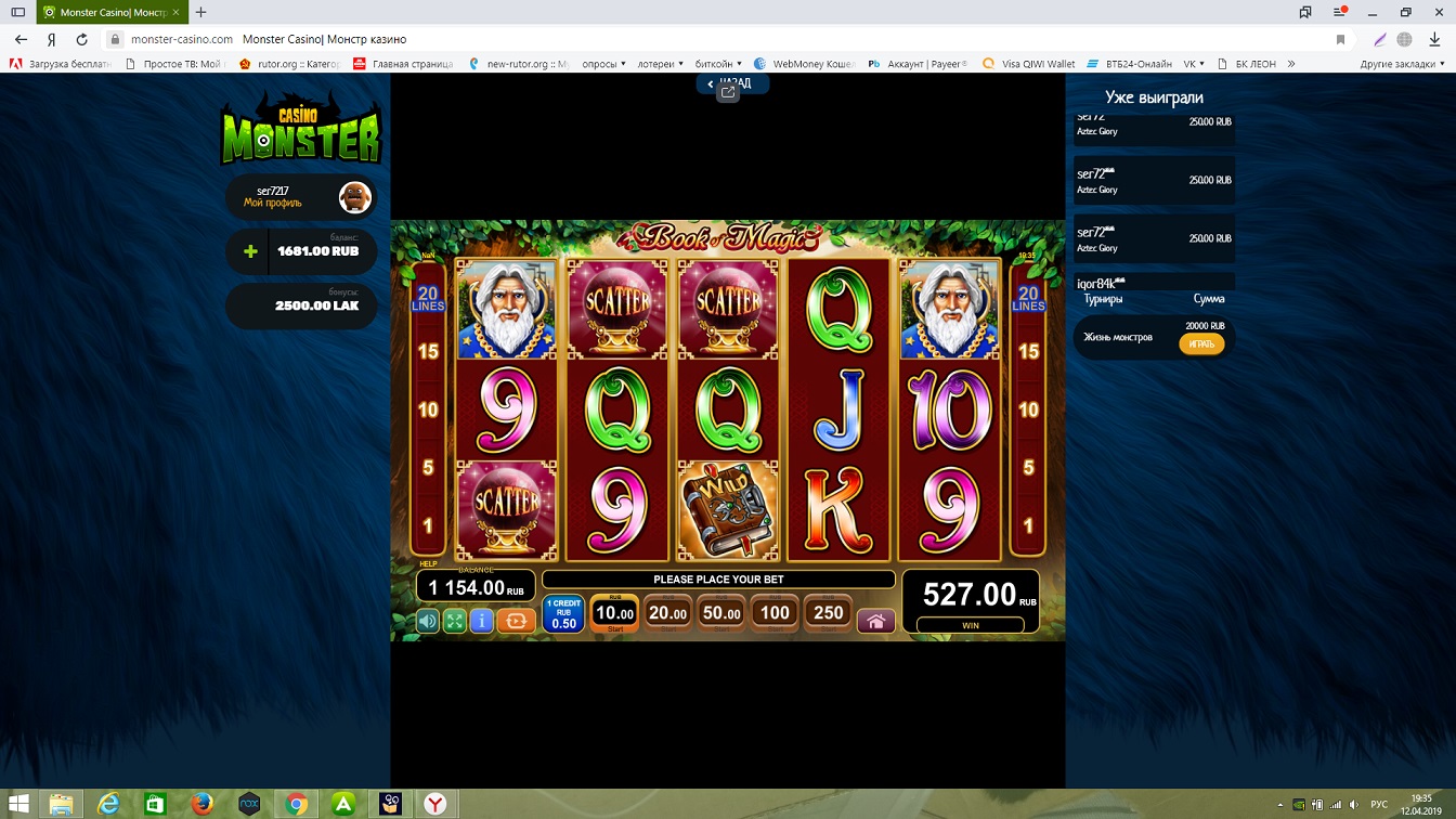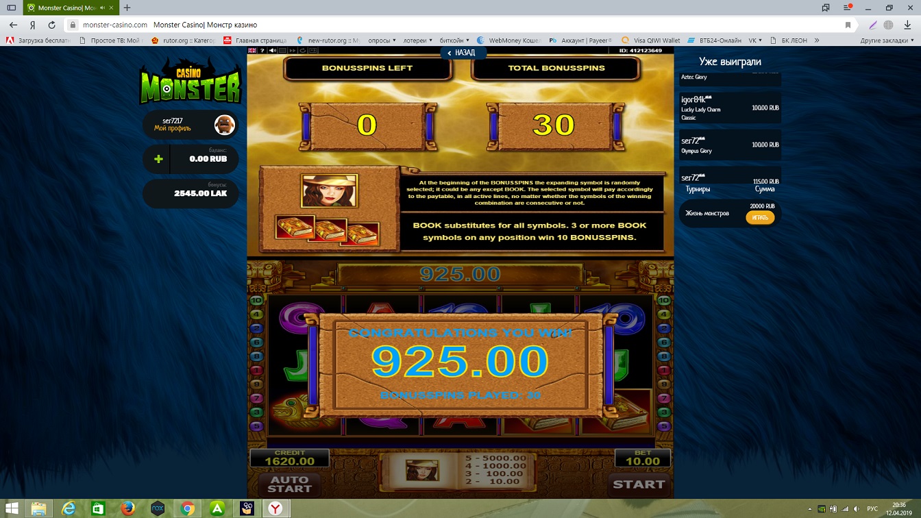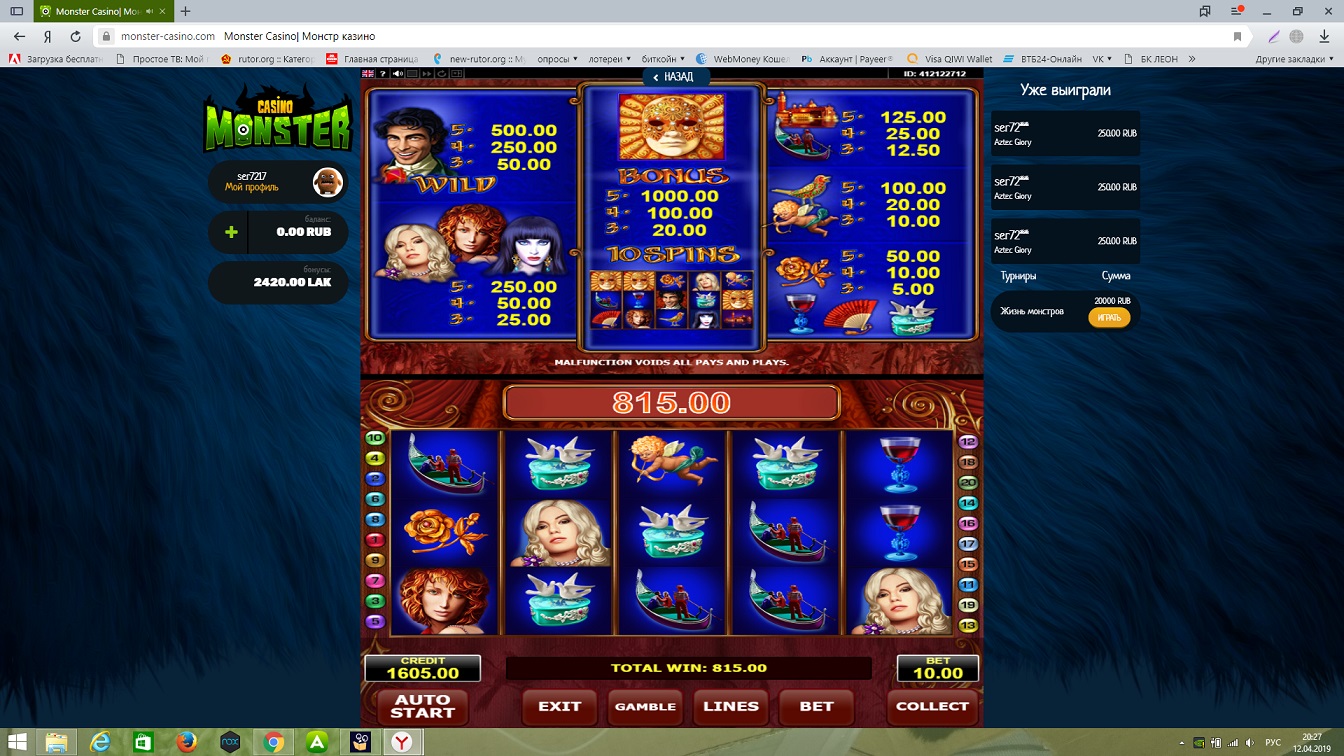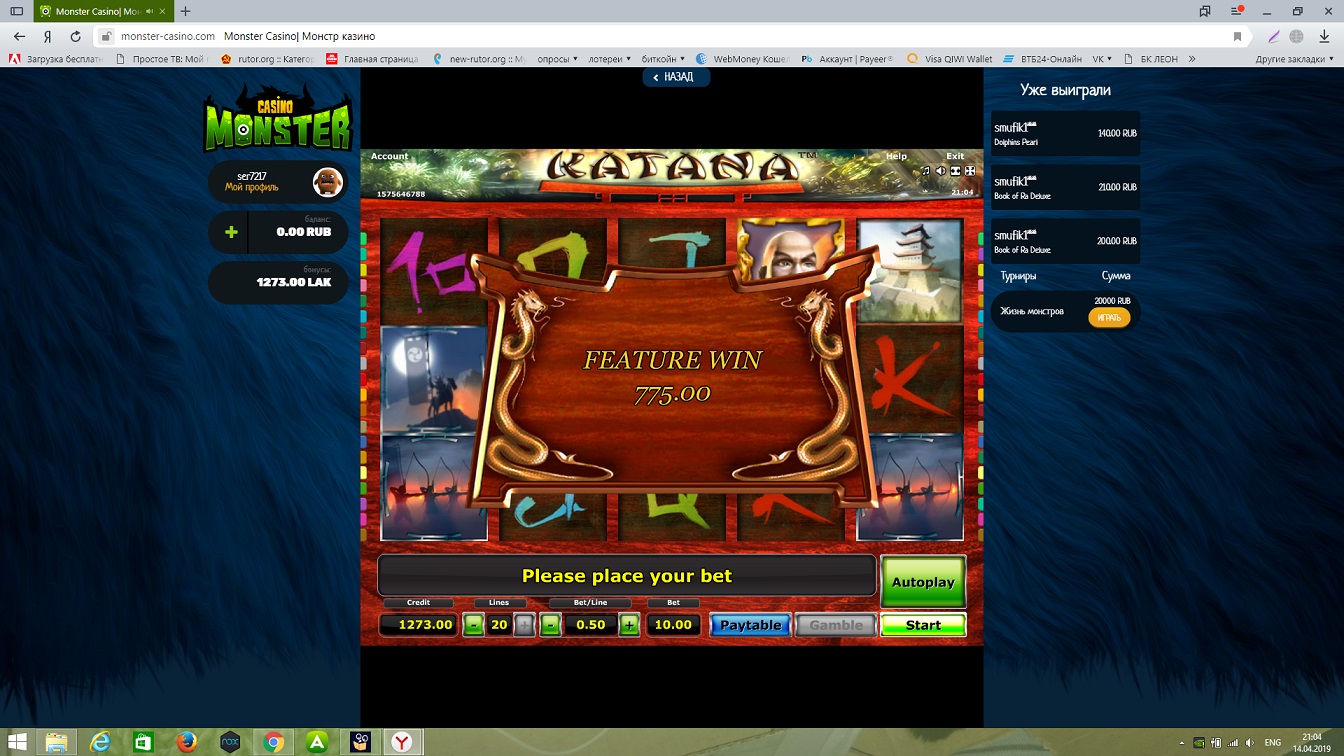 · На скриншоте должно быть видно, что он сделан в Монстр Казино, а так же дата и время.