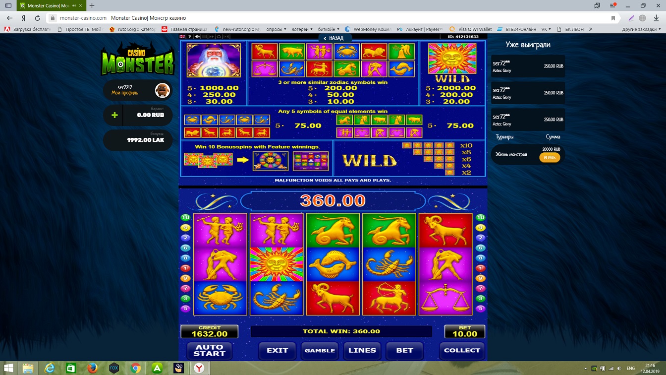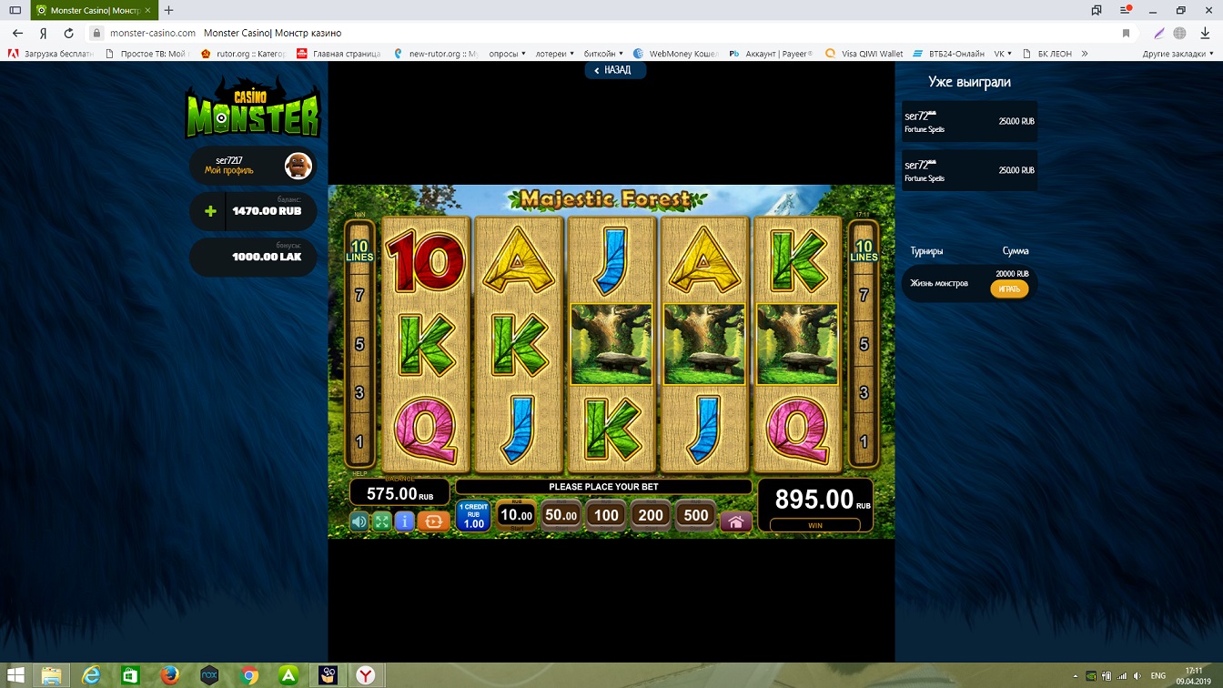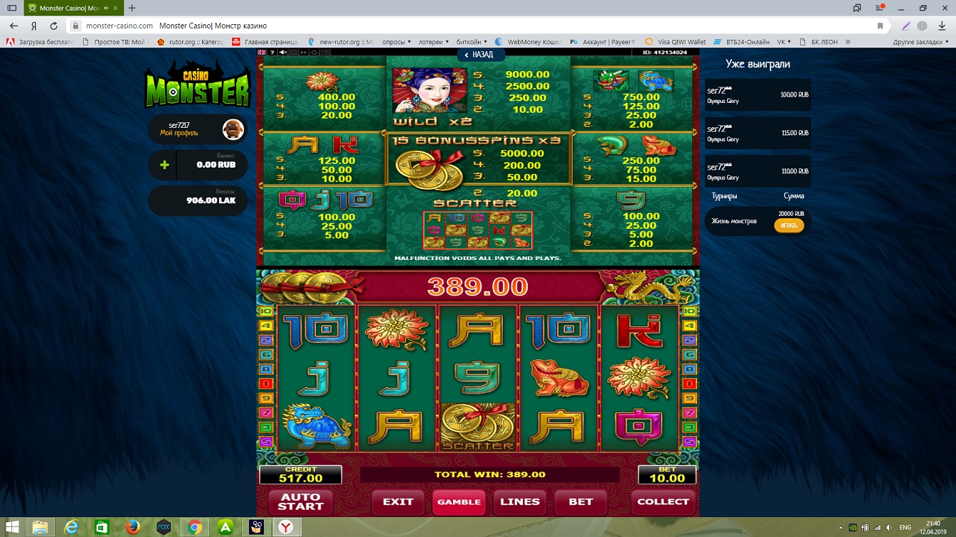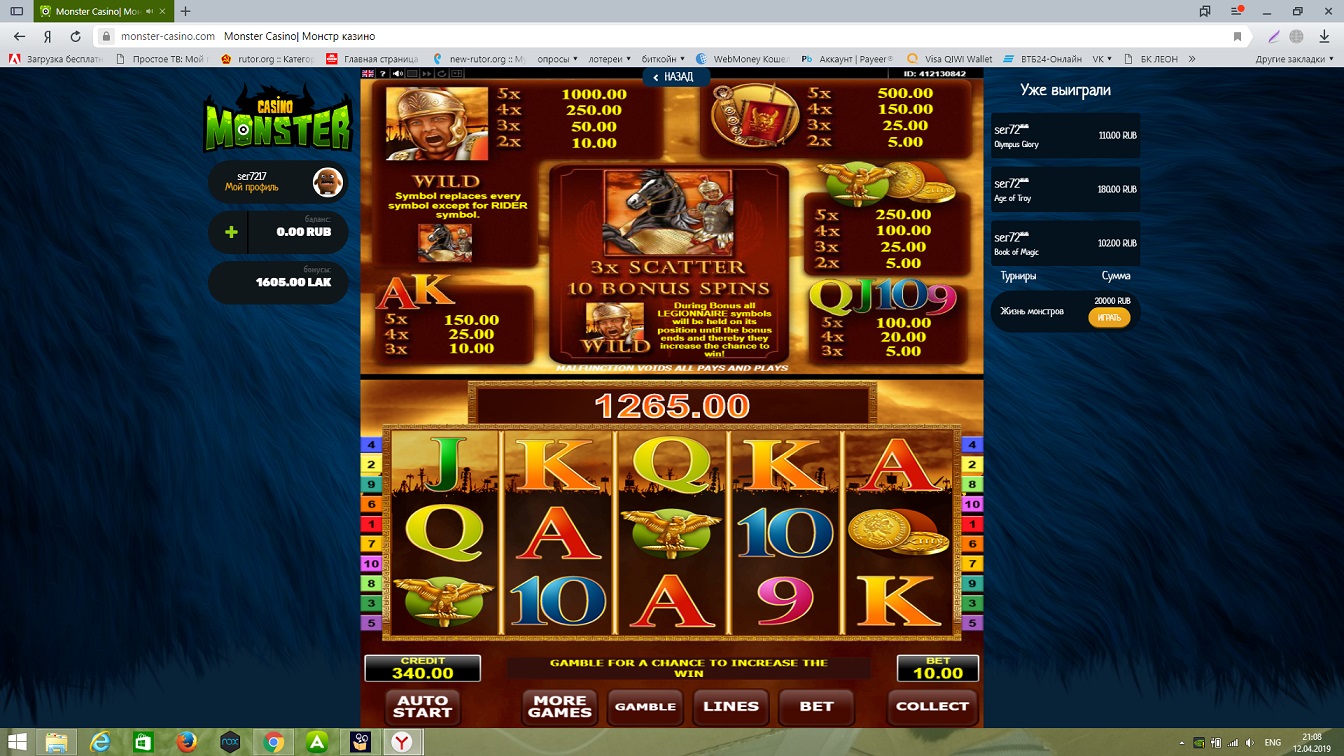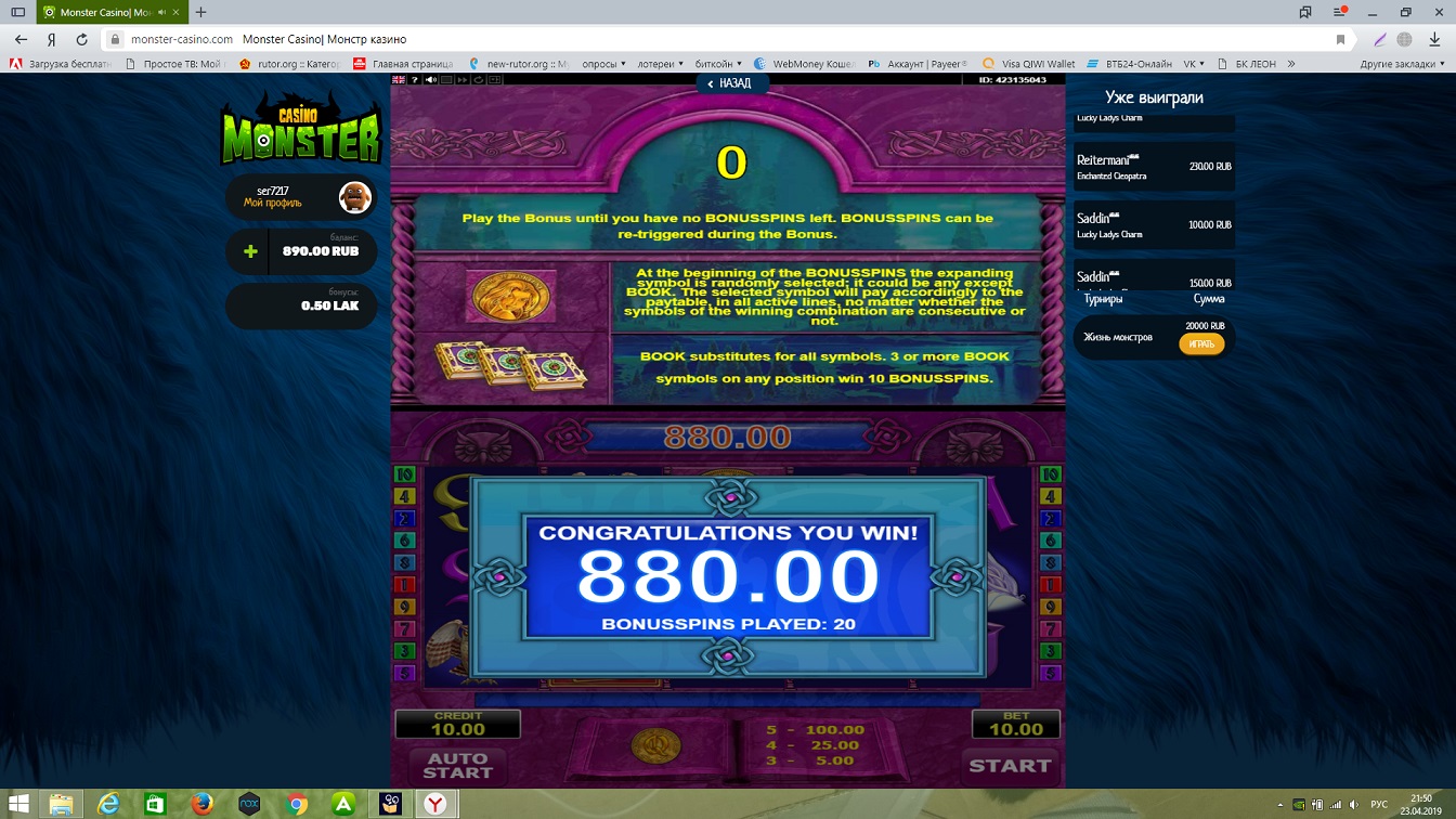 · На скриншоте должно быть видно, что он сделан в Монстр Казино, а так же дата и время.