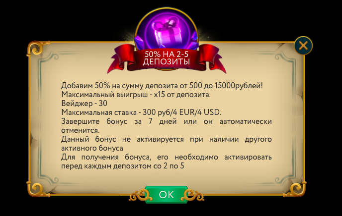 Обращаем внимание, что на бонусах, содержащих исключительно бесплатные вращения, вейджер накладывается на сумму выигрыша с этих вращений.