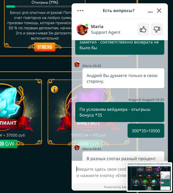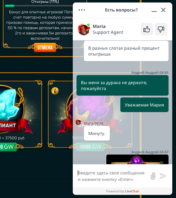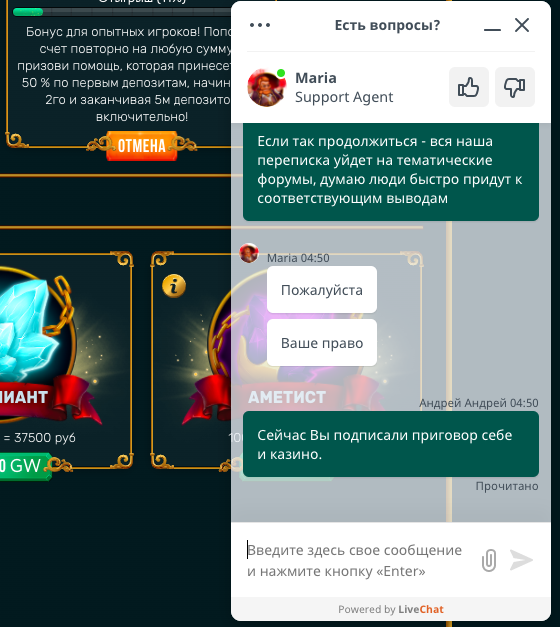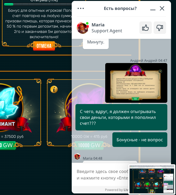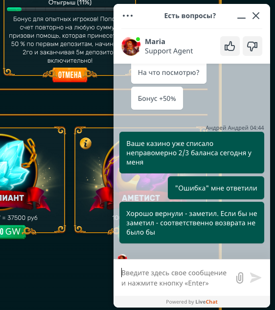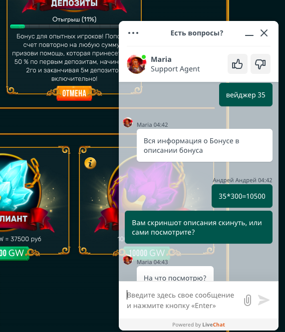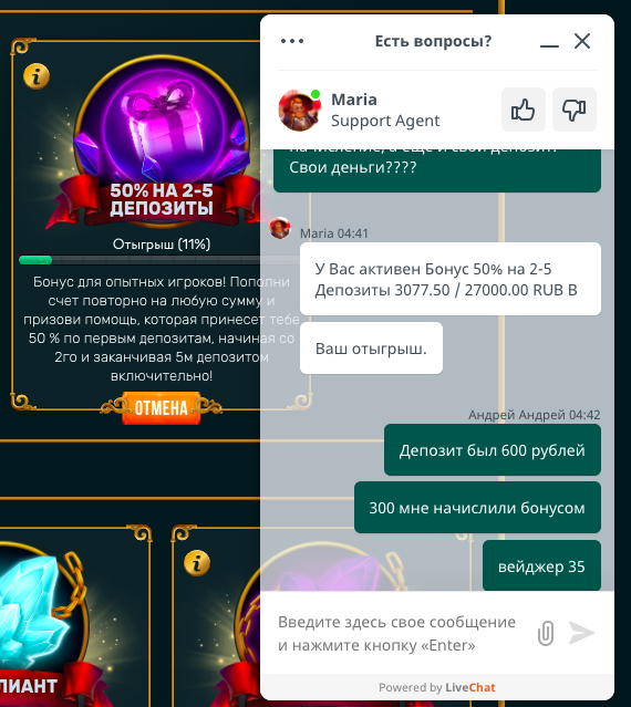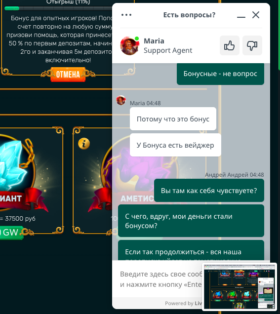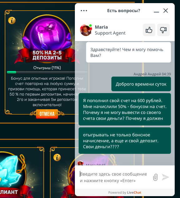Итак, решил воспользоваться бонусом данного онлайн казино. Бонусом вполне обычным, 50% на депозит со второго пополнения. Закинул 600 рублей. Бонус, соответственно, составил 300. Вагер *30, Ну думаю ок. В итоге, как оказалось, я обязан отыгрывать не только начисленный бонус, а вообще весь баланс............. В общем в личном кабинете у меня нарисован бонус 432,80 и отыгрыш, который теперь необходимо отыграть чтобы вывести СВОИ деньги с депозита - 27 000 руб. Каким образом это все подсчитывалось, почему я не могу вывести свои деньги (не бонусные, именно свои), и почему об этом АБСОЛЮТНО НИГДЕ НЕ УПОМИНАЕТСЯ - не понятно... А я думал, что нашел нормально казино с интересным дизайном, подающее надежны... И, как я понимаю, абсолютно все бонусы этого казино устроены таким образом. Получаются не бонусы/фриспины/бездеп а с точностью до наооборот - лютый оброк! Ниже скрины переписки с "Support Agent" (поддержкой по чату).