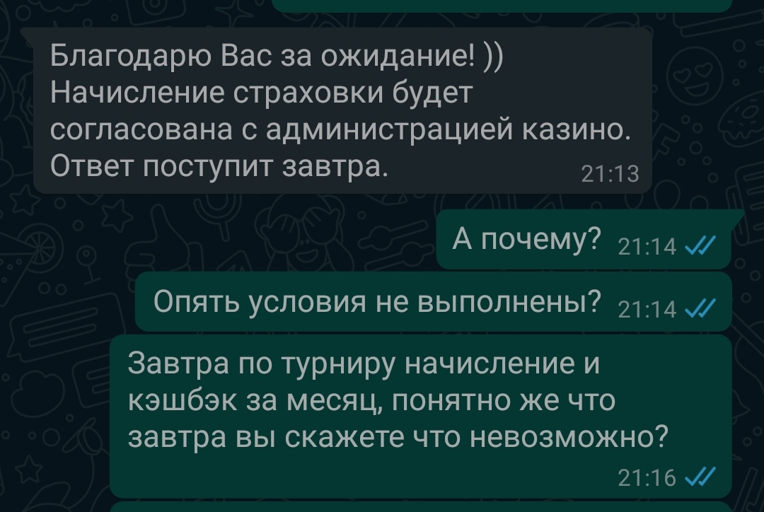 Тут не может быть никаких обид или претензий (по теме страховки депозита), поскольку это дополнительная услуга, которая не входит в обязательные бонусы сайта, казино в праве отказать в предоставлении данной страховки, если посчитает это нужным и тут дело не только в сумме, а в целом.