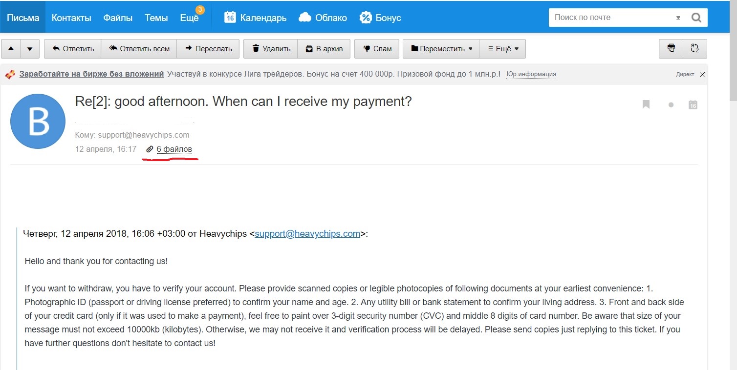 Пускай менеджер предоставит скрины где видно, что письма от меня пришли пустые, без файлов, без документов. Если это реально так могу в скайп отправить лично, даже видеоверификацию пройти.