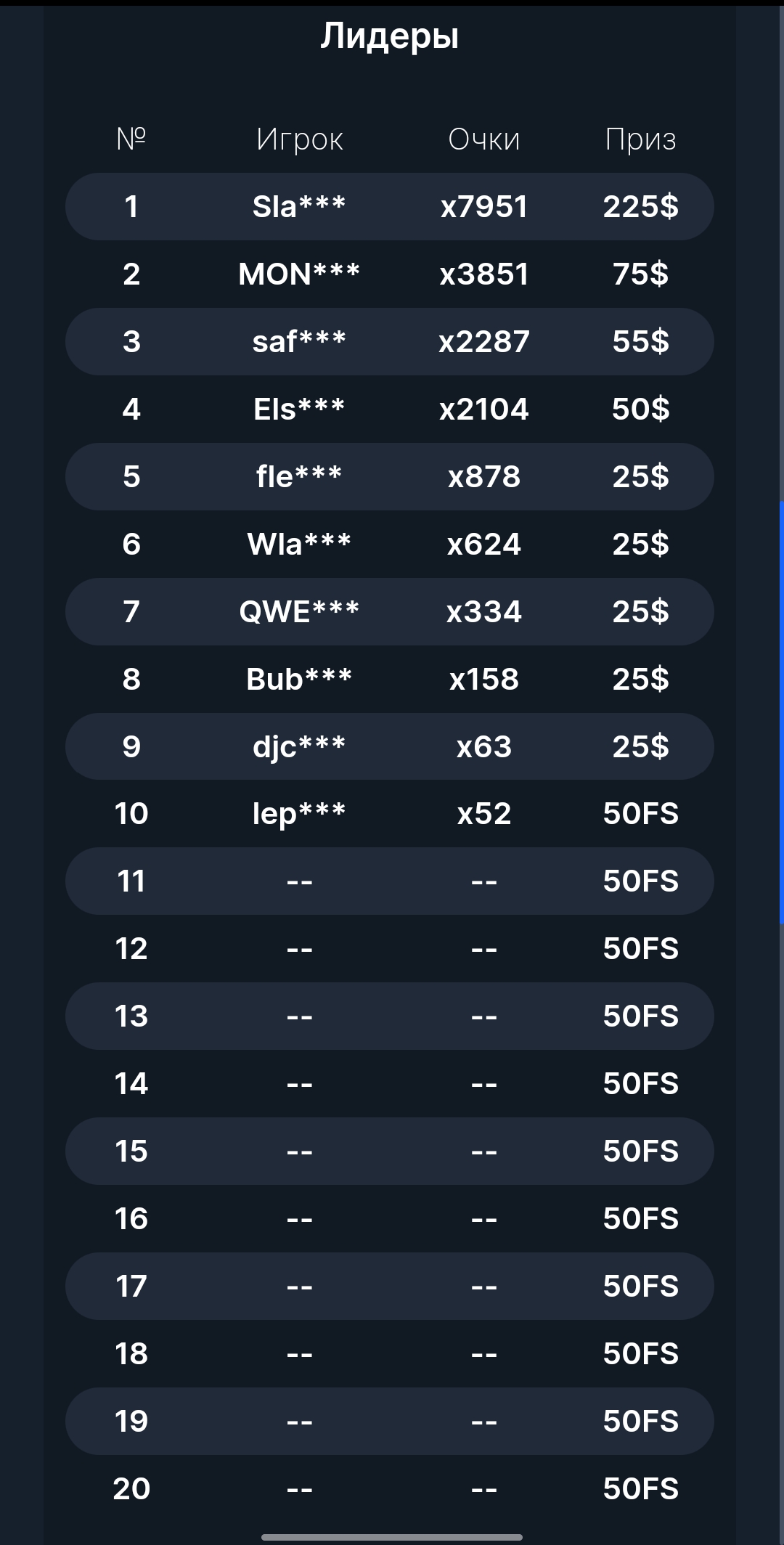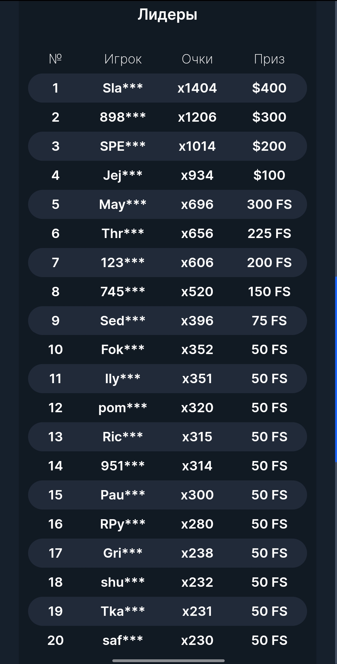 Уже один из наших форумчан обогнал всех сразу в двух турнирахВ обоих на первом месте, @Slavash если ты вдруг делал скрин заноса поделись в теме
