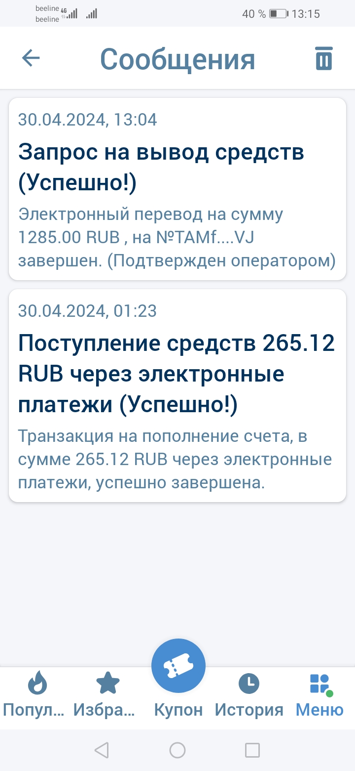 — Выбери одну из поддерживаемых нами криптовалют и скопируй адрес депозита для дальнейшей отправки с криптокошелька или сайта обмена.