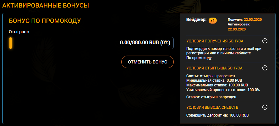 После отыгрыша фриспинов, необходимо сделать минимальный депозит и оборот ставок х1 от суммы депозита для Вывода.