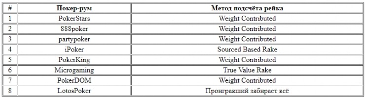 Weighted Contributed — самый популярный на сегодня метод расчета рейка. Его суть состоит в том, что каждый игрок получает столько рейка, сколько дeнeг в банк он внёс. И это наиболее объективная форма взимания рейка. Такой метод подсчета сегодня используется в большинстве румов.