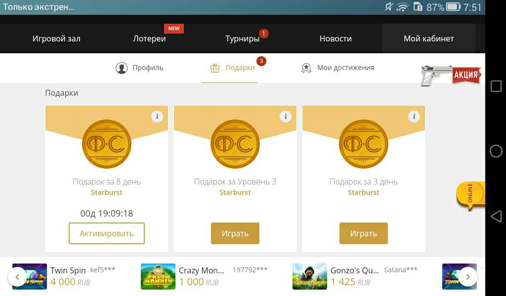 У меня тоже сегодня 3 день и тоже дали спины в стройбате,у меня два счёта $ и руб,только в $ я открутил а в рублях я не мог активировать подарок (вернее я его активировал но спинов типа нет),пришлось с ПК запускать....
