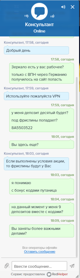 хотел депнуть под фриспины на десятый деп,но после "общения" с "оператором" понял что мне там не рады...