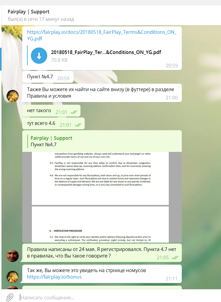 Ну понятно, решили лгать до конца, вот pdf файл скачаный вчера 05/11/2018 с сайта fairplay и в нем нет пункта 4.7, я понимаю что вы уже ничего не заплатите, но для всех очевидна ваша ложь.Кто будет делать депозит к тем кто меняет правила на ходу? Мошенники.