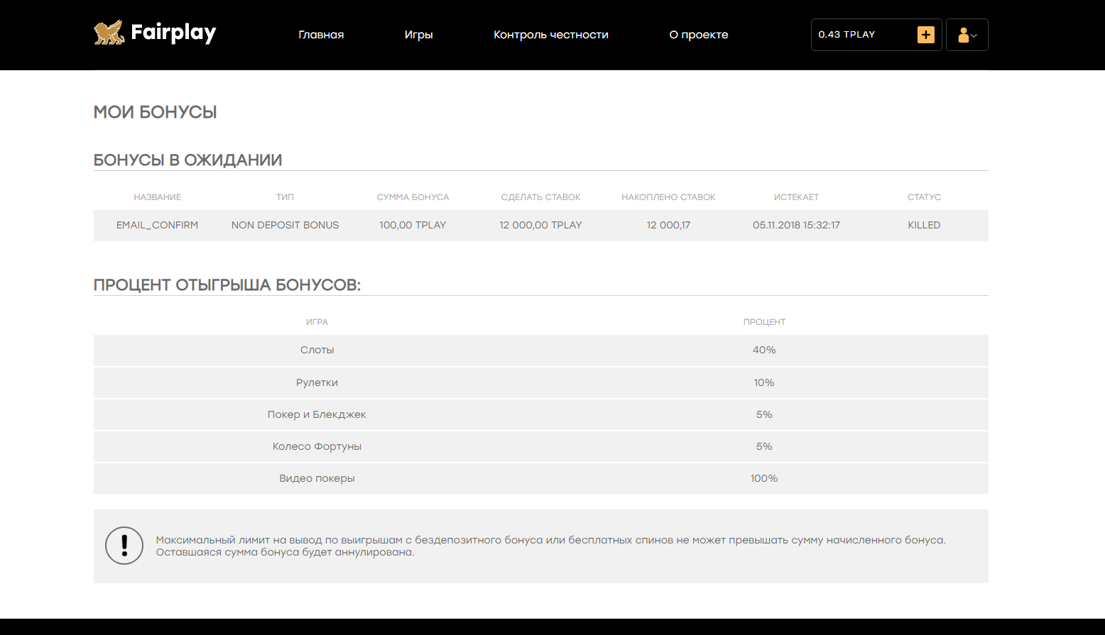 Напоминаю, что в правилах, а также в разделе Бонусы на сайте FairPlay.io указано: «Максимальный лимит на вывод по выигрышам с бездепозитного бонуса или бесплатных спинов не может превышать сумму начисленного бонуса. Оставшаяся сумма бонуса будет аннулирована». О чем Вы были проинформированы сотрудником техподдержки в телефонном режиме. Соответственно, в истории операций Вы видите полную сумму вместе с остатком бонуса. В момент обработки транзакции, остаток был аннулирован.